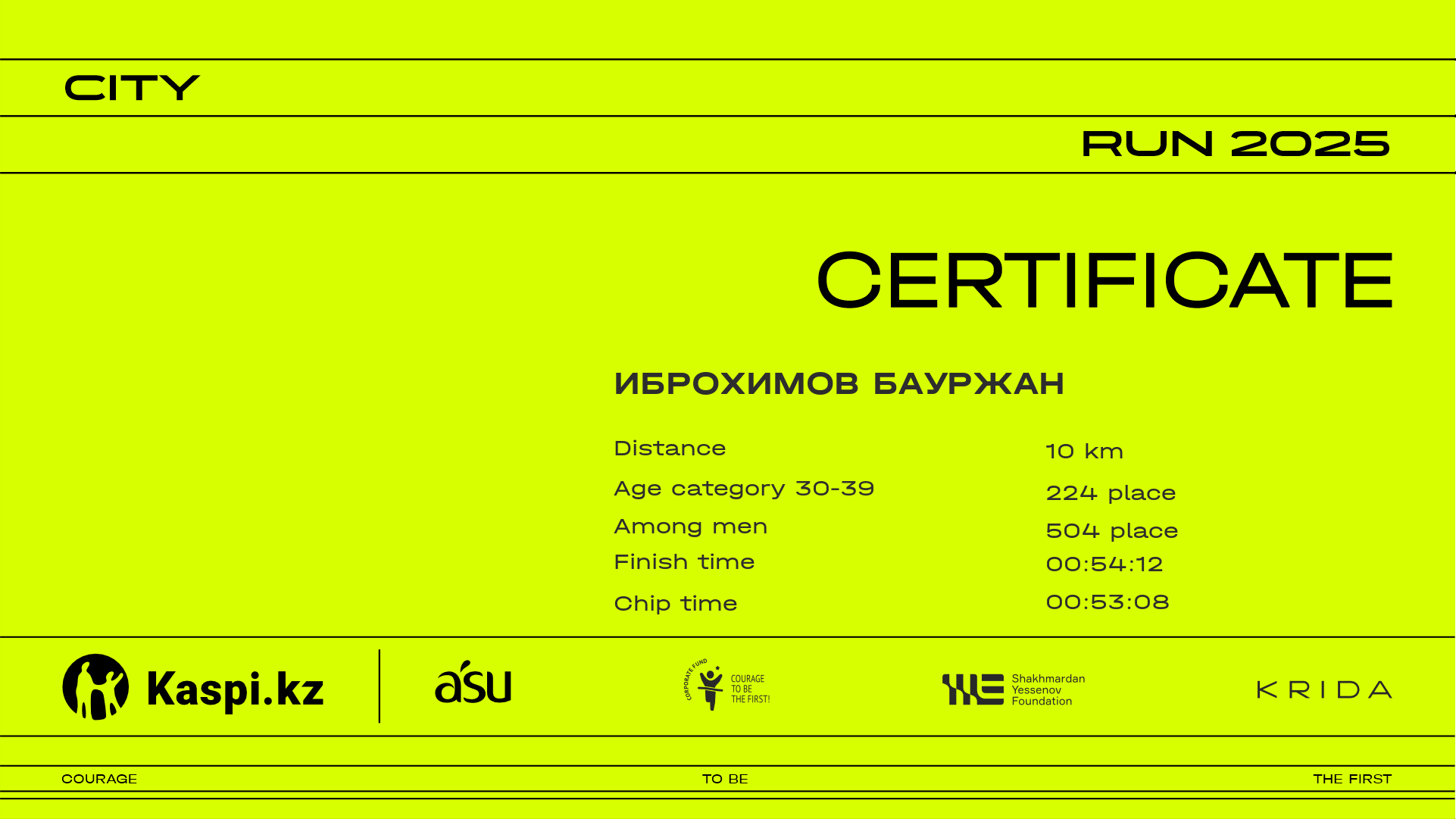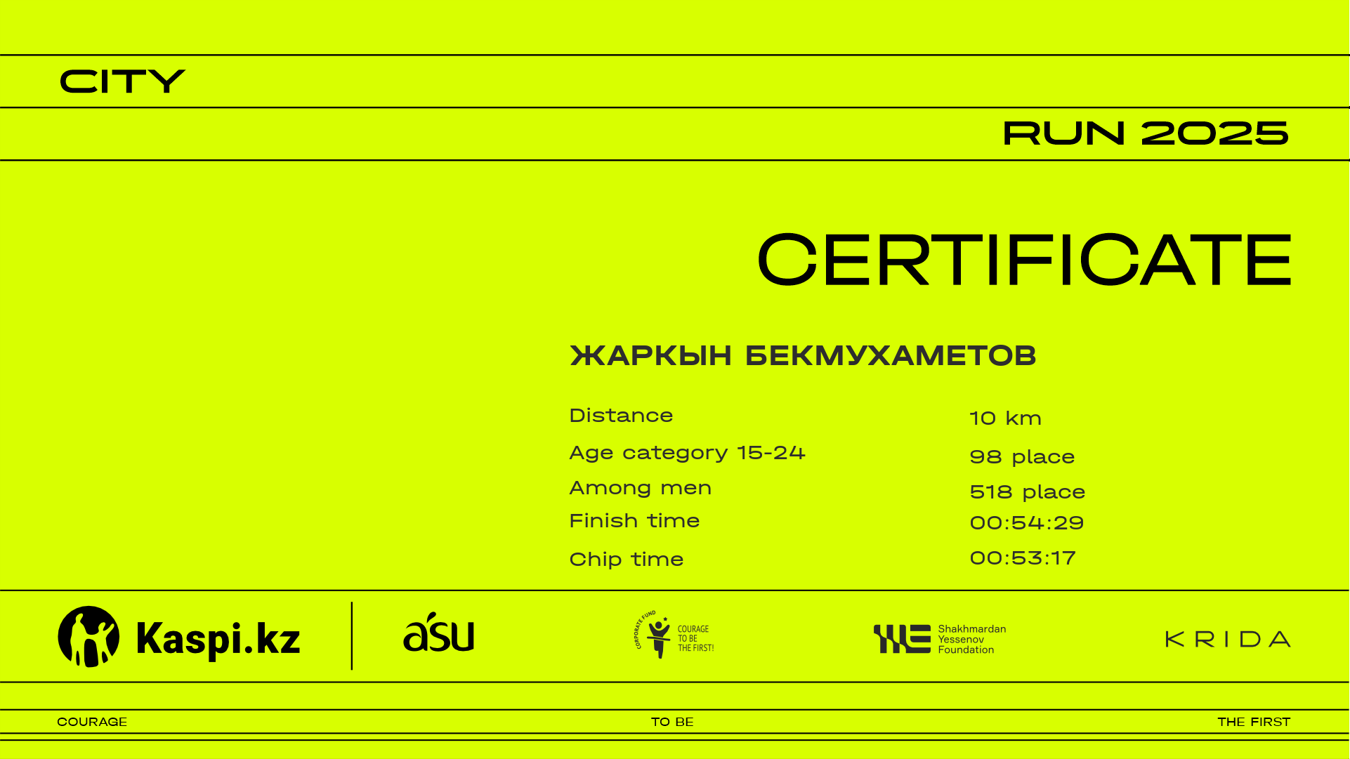 | 617 | Данияр Абсатов | ![]() | Алматы | 840 | 00:14:10 | 00:23:41 | 00:34:00 | 00:44:35 | 00:52:55 | 00:54:17 | 00:54:07 | Download |