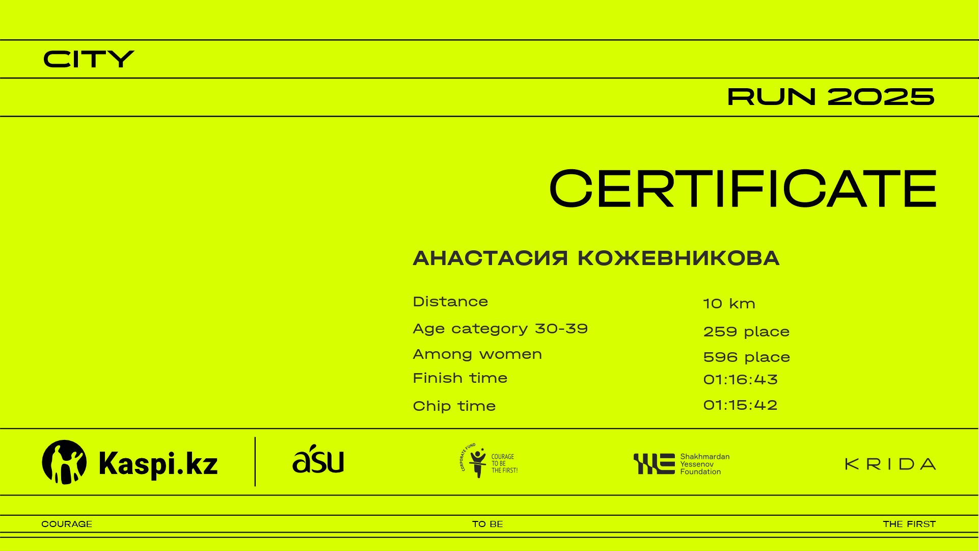 | 1658 | Janelle Abildayeva | ![]() | Almaty | 597 | 00:20:16 | 00:34:00 | 00:48:43 | 01:03:54 | 01:15:23 | 01:16:54 | 01:16:00 | Download |