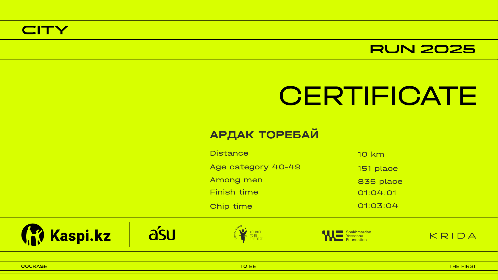| 5 | Akimzhan Yelekenov | ![]() | Almaty | 1120 | 00:08:25 | 00:14:30 | 00:21:10 | 00:27:58 | 00:32:55 | 00:33:42 | 00:33:41 | Download |