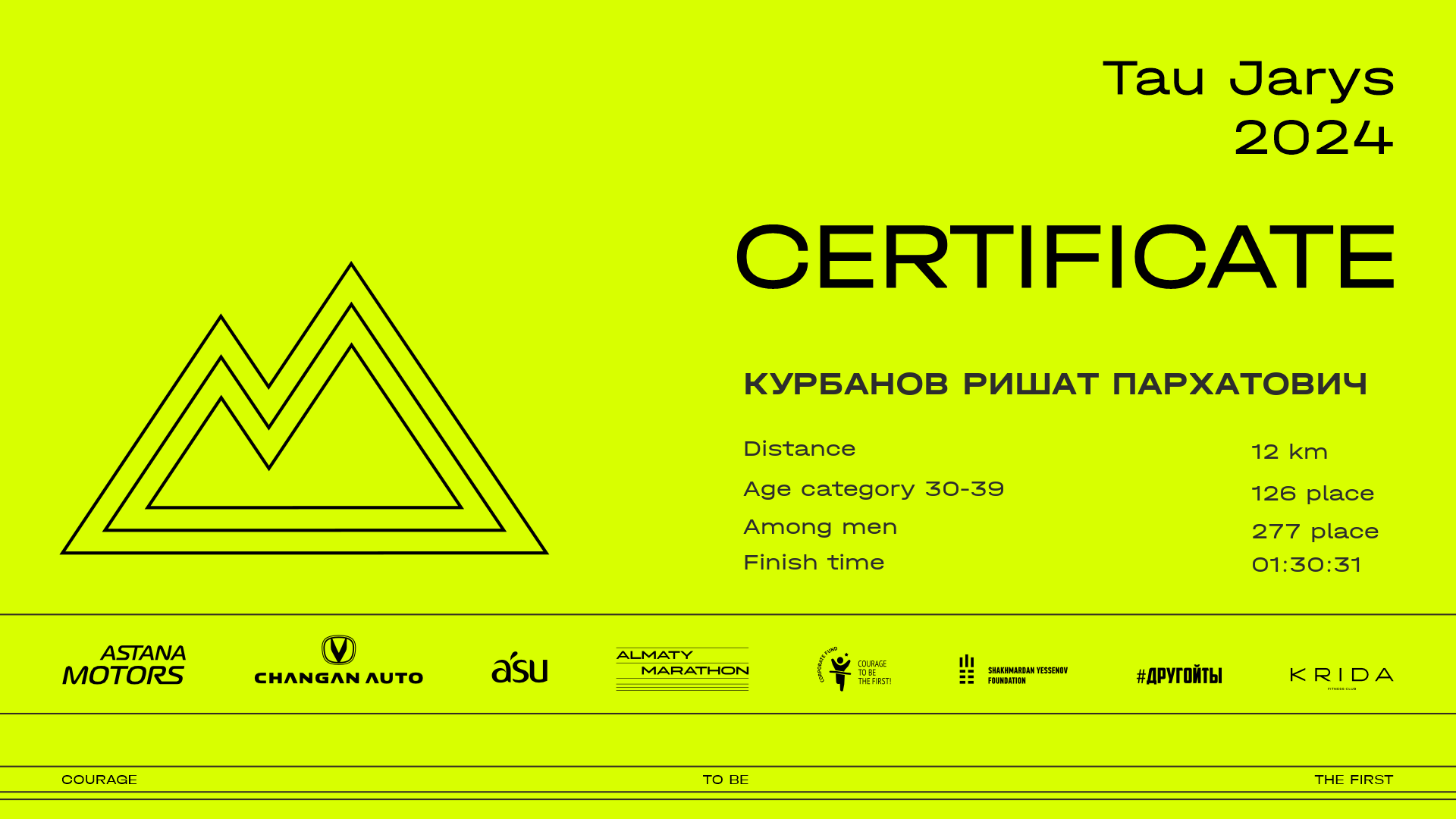 | 319 | Айдар Заурбек | ![]() | Алматы | 313 | 00:12:08.82 | 00:30:25.22 | 00:57:17.36 | 01:15:51.64 | 01:30:03.27 | 01:29:49.85 |
