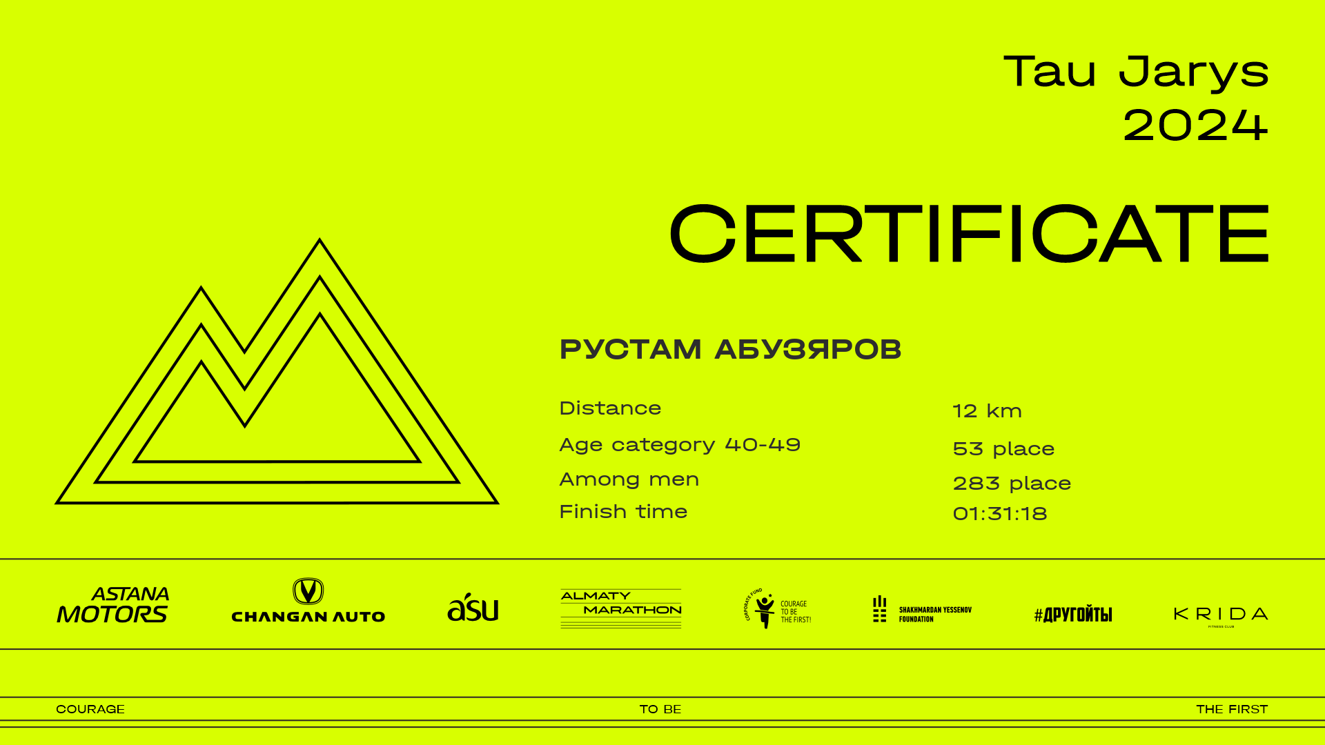 | 336 | Рустам Абузяров | ![]() | Алматы | 226 | 00:11:59.37 | 00:30:28.66 | 00:58:39.45 | 01:16:50.20 | 01:31:18.10 | 01:31:02.82 | Download |