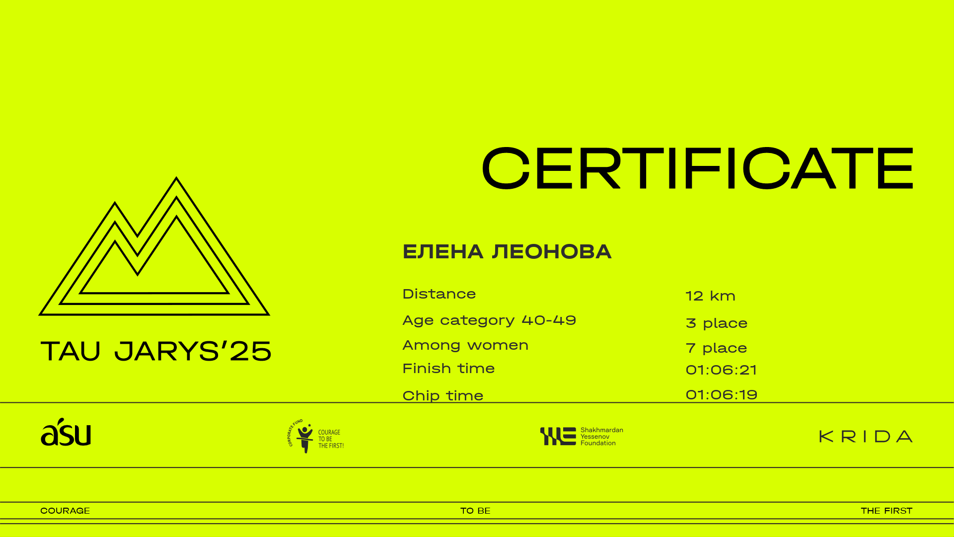 | 70 | Елена Леонова | ![]() | Алматы | 356 | 00:07:28.90 | 00:19:53.70 | 00:26:25.40 | 00:40:35.90 | 00:54:08.40 | 01:00:54.60 | 01:06:21.60 | 01:06:19.50 | Download |