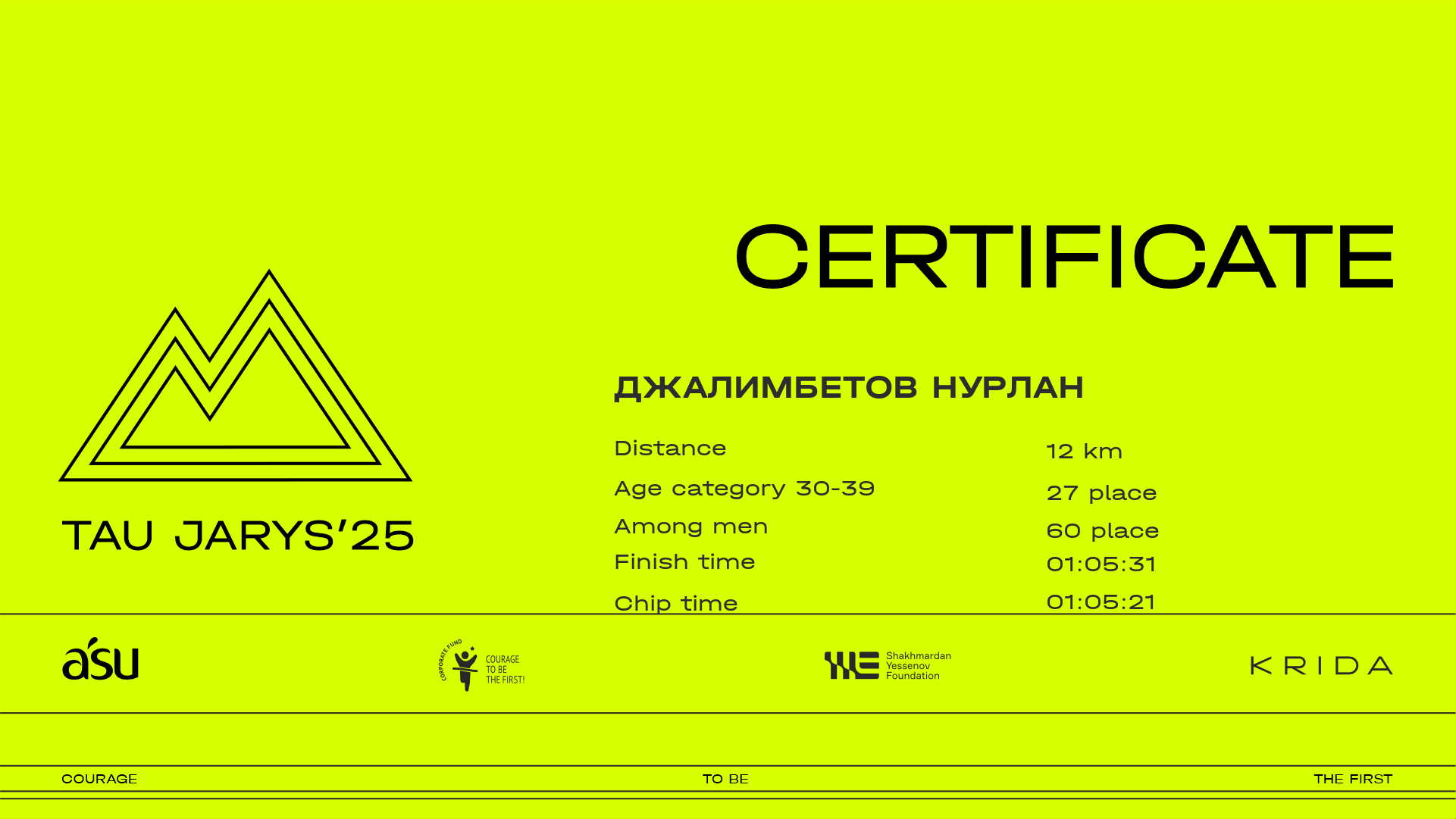 | 86 | Жомарт Әлібай | ![]() | Алматы | 499 | 00:07:26.30 | 00:20:12.90 | 00:27:38.30 | 00:43:10.10 | 00:56:13.60 | 01:02:17.40 | 01:08:08.60 | 01:08:06.50 | Download |