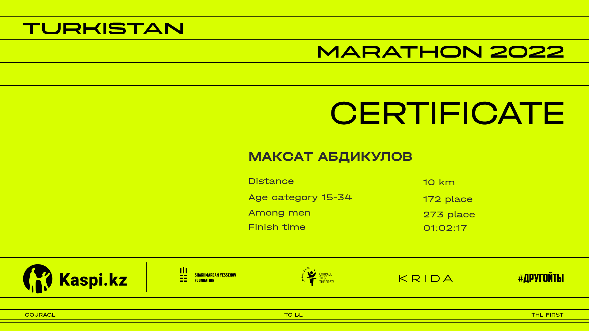 | 382 | Баходир Ниязходжаев | ![]() | Шымкент | 1709 | 00:32:11.71 | 01:03:07.20 | 01:02:59.20 | Download |