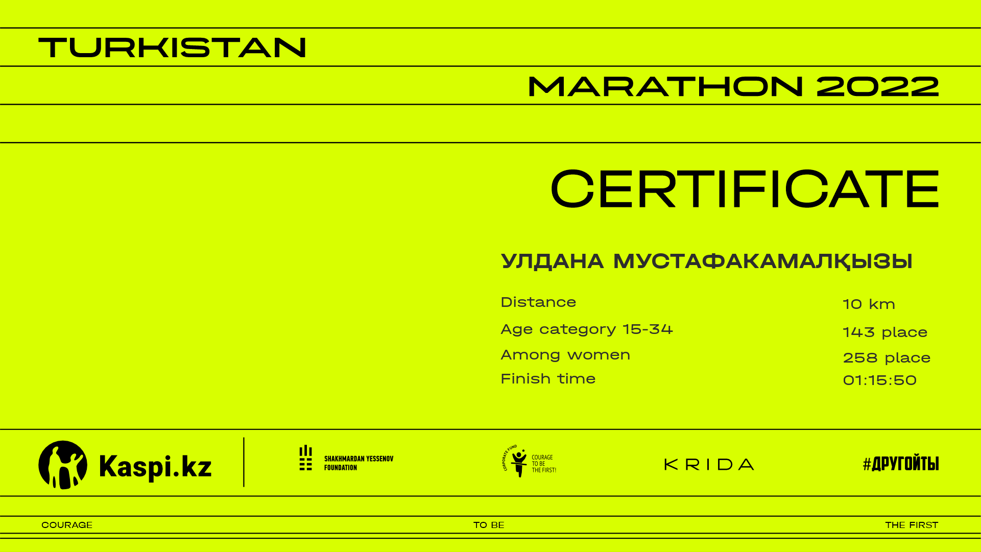 | 658 | Madina Zhaksylyk | ![]() | Шымкент | 1189 | 00:39:13.88 | 01:18:15.39 | 01:17:43.45 | Download |