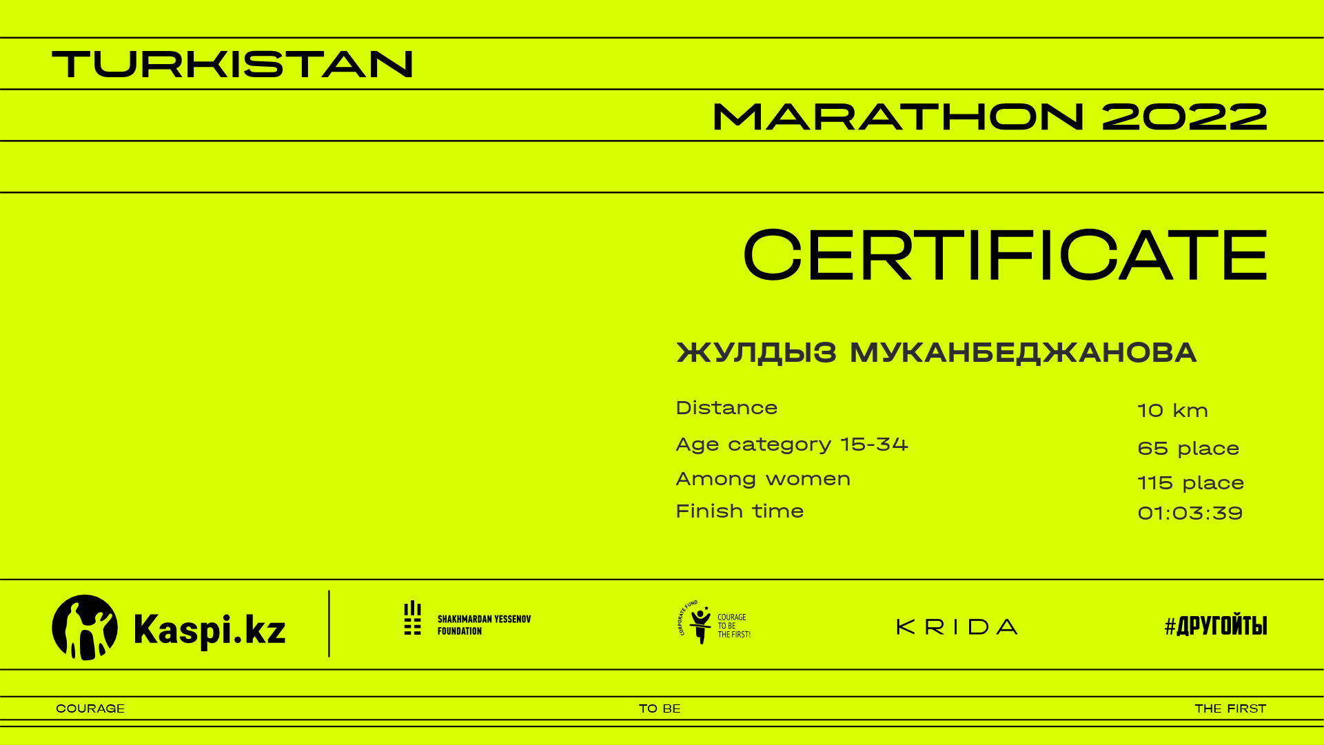 | 383 | Урзада Есалиева | ![]() | Шымкент | 800 | 00:31:05.64 | 01:03:13.24 | 01:02:49.55 | Download |