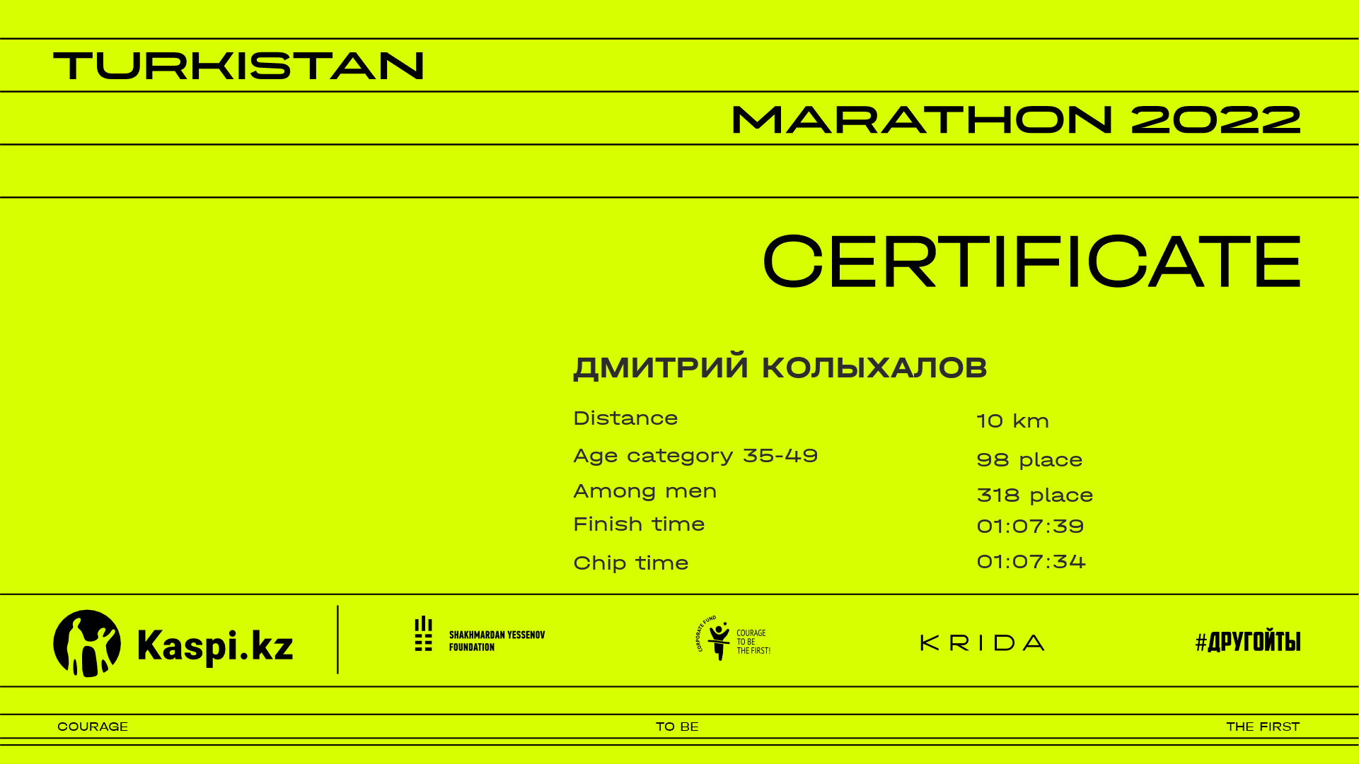 | 490 | Nurtas Utetileuov | ![]() | Shymkent | 1540 | 00:35:01.80 | 01:07:38.93 | 01:07:17.30 | Download |