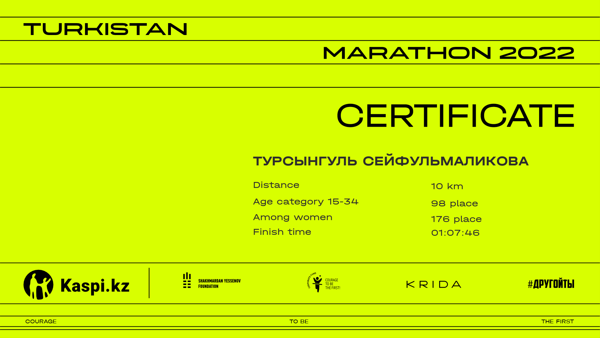 | 383 | Урзада Есалиева | ![]() | Шымкент | 800 | 00:31:05.64 | 01:03:13.24 | 01:02:49.55 | Download |
