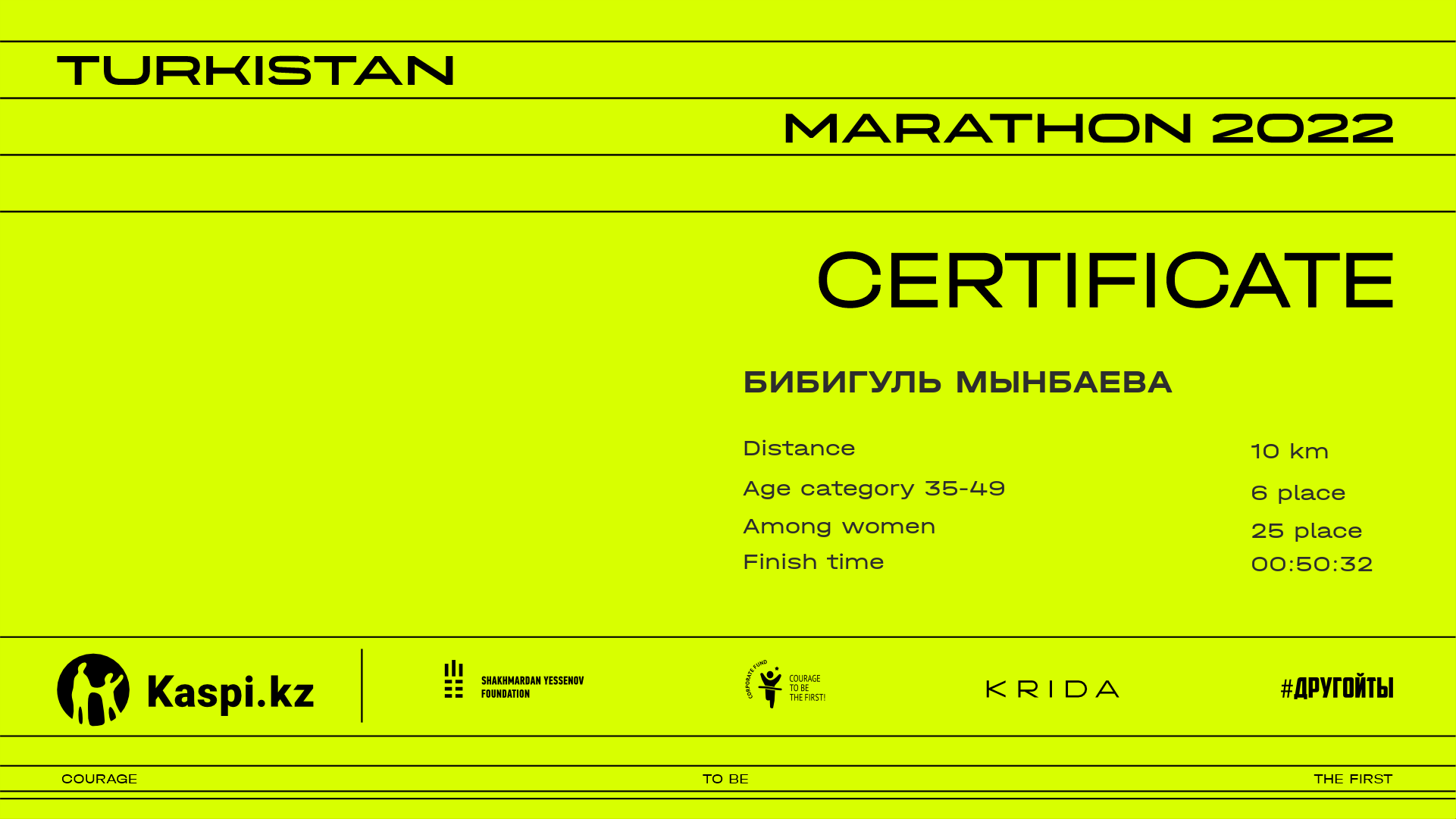 | 143 | Meruyert Jankurazova | ![]() | Алматы | 890 | 00:25:07.94 | 00:50:29.11 | 00:50:32.34 | Download |