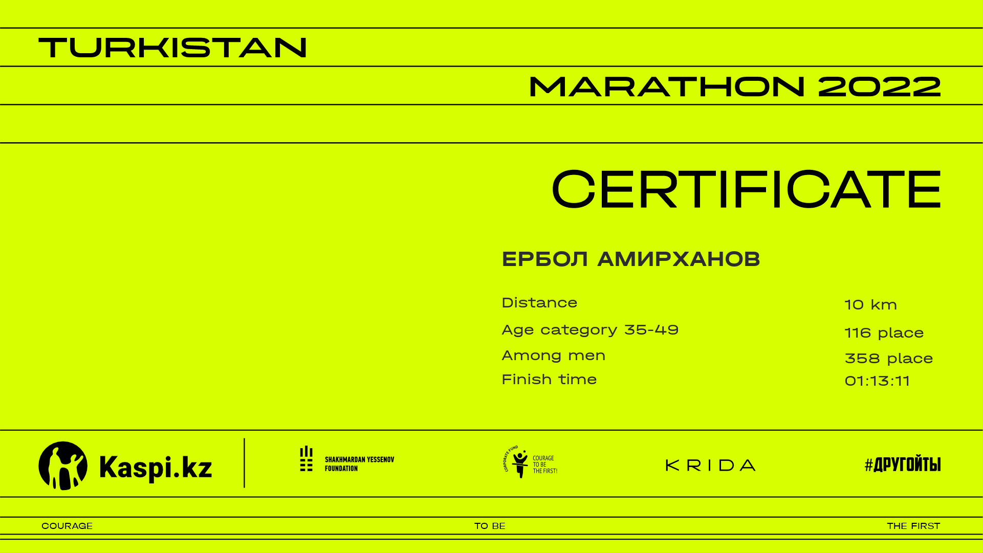 | 594 | Ербол Амирханов | ![]() | Талгар, Алматинская область | 850 | 00:35:33.73 | 01:13:11.76 | 01:12:56.29 | Download |