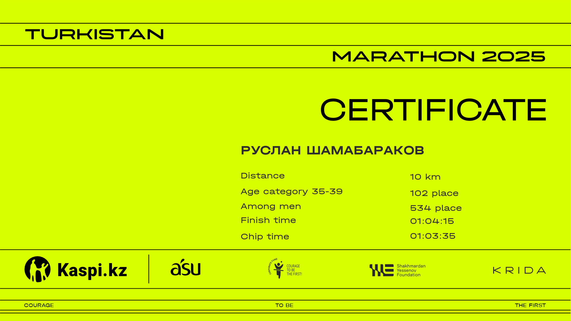 | 754 | Жасұлан Абдикахар | ![]() | Шымкент | 1864 | 00:40:50 | 01:05:00 | 01:04:09 | Download |