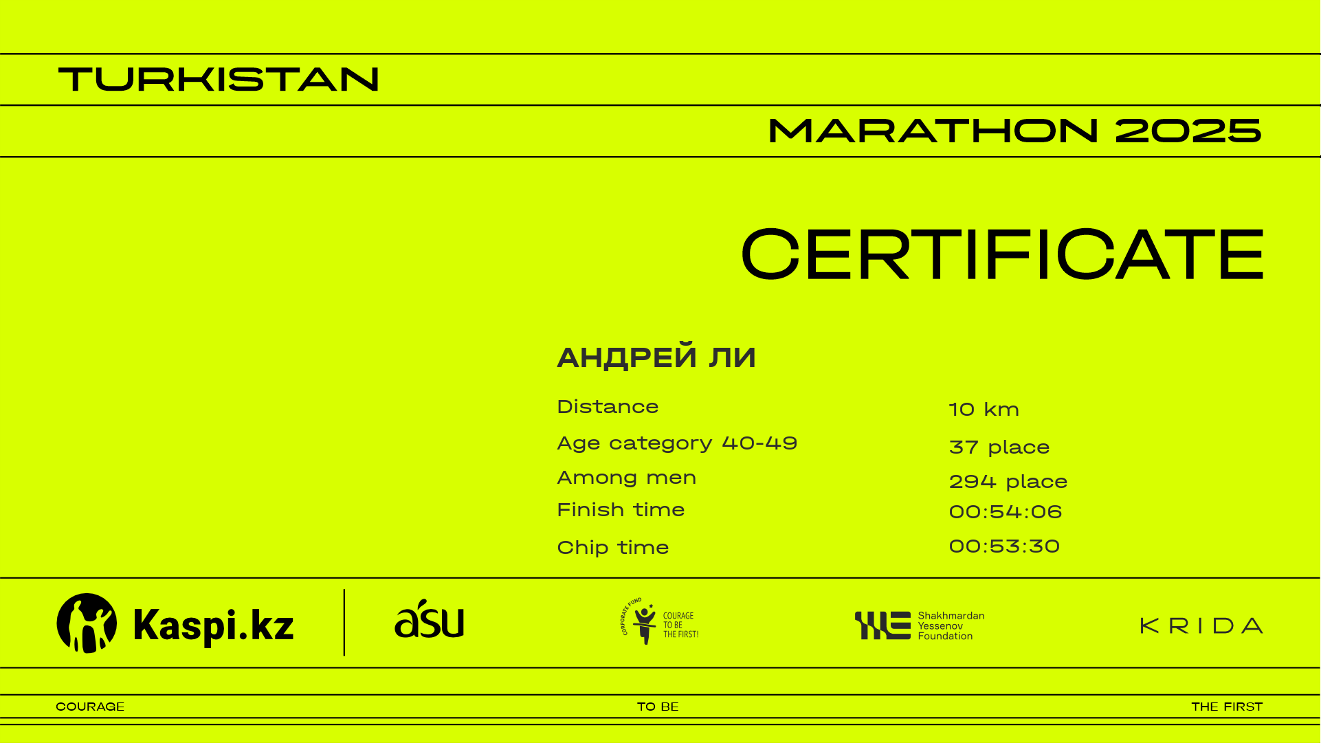 | 346 | Mukhammadali Ramankulov | ![]() | Шымкент | 1400 | 00:34:53 | 00:53:39 | 00:53:33 | Download |
