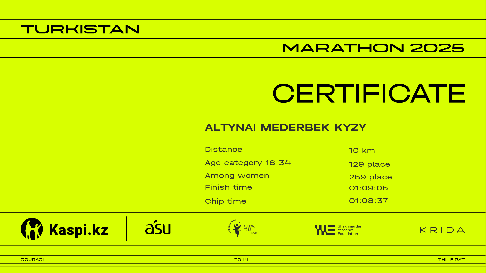 | 860 | Altynai Mederbek kyzy | ![]() | Бишкек | 1648 | 00:42:34 | 01:09:05 | 01:08:37 | Download |