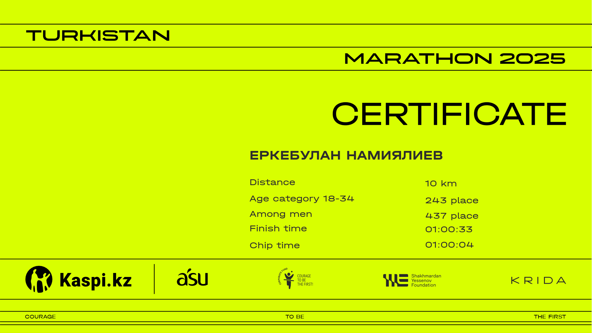 | 660 | Мухамаддин Турсунбаев | ![]() | Туркестан | 2303 | 00:38:04 | 01:02:31 | 01:02:11 | Download |
