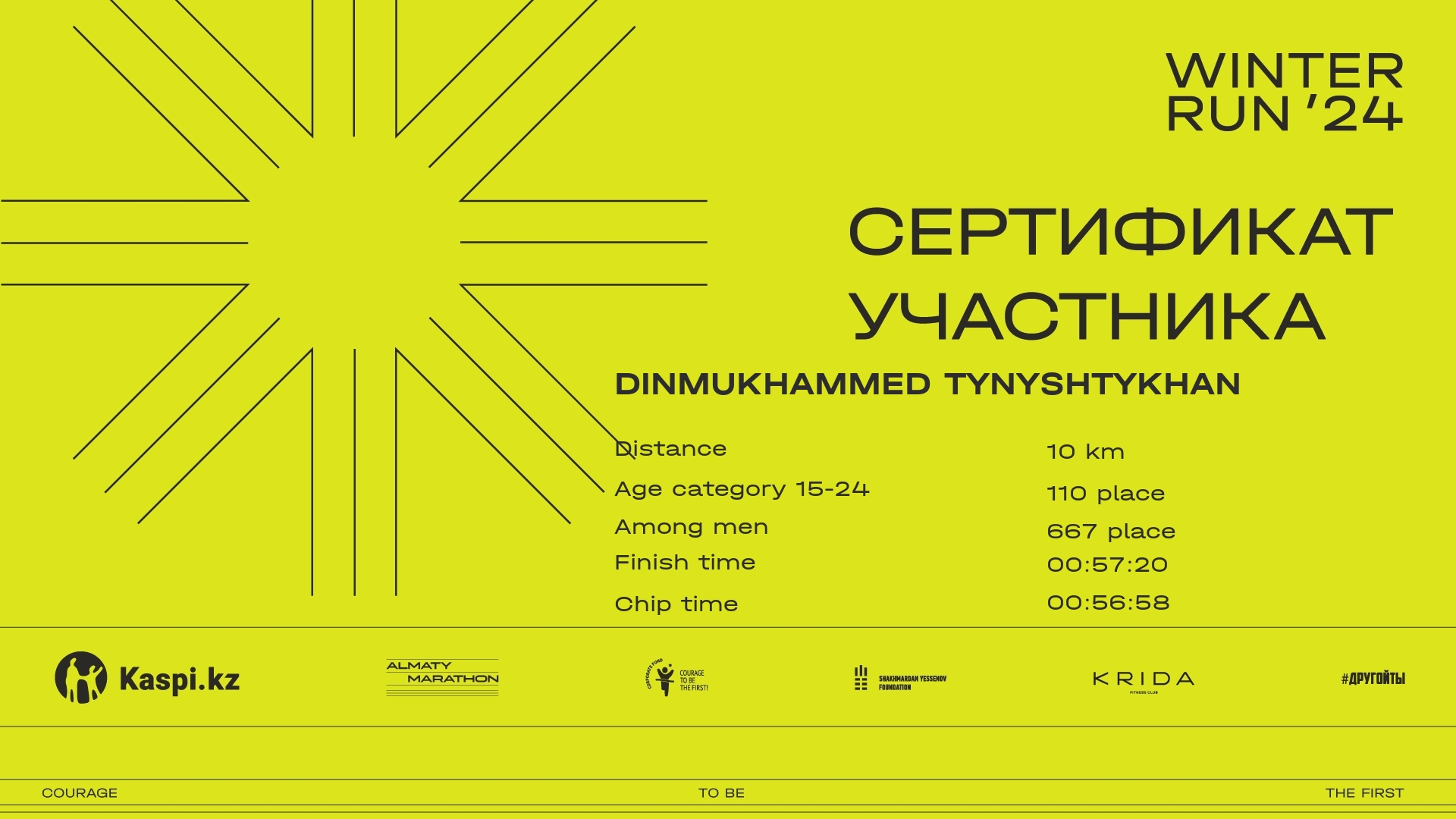 | 1332 | Алтынбек Камалов | ![]() | Алматы | 112 | 00:10:43 | 00:35:00 | 00:58:02 | 01:08:17 | 01:07:32 | Download |