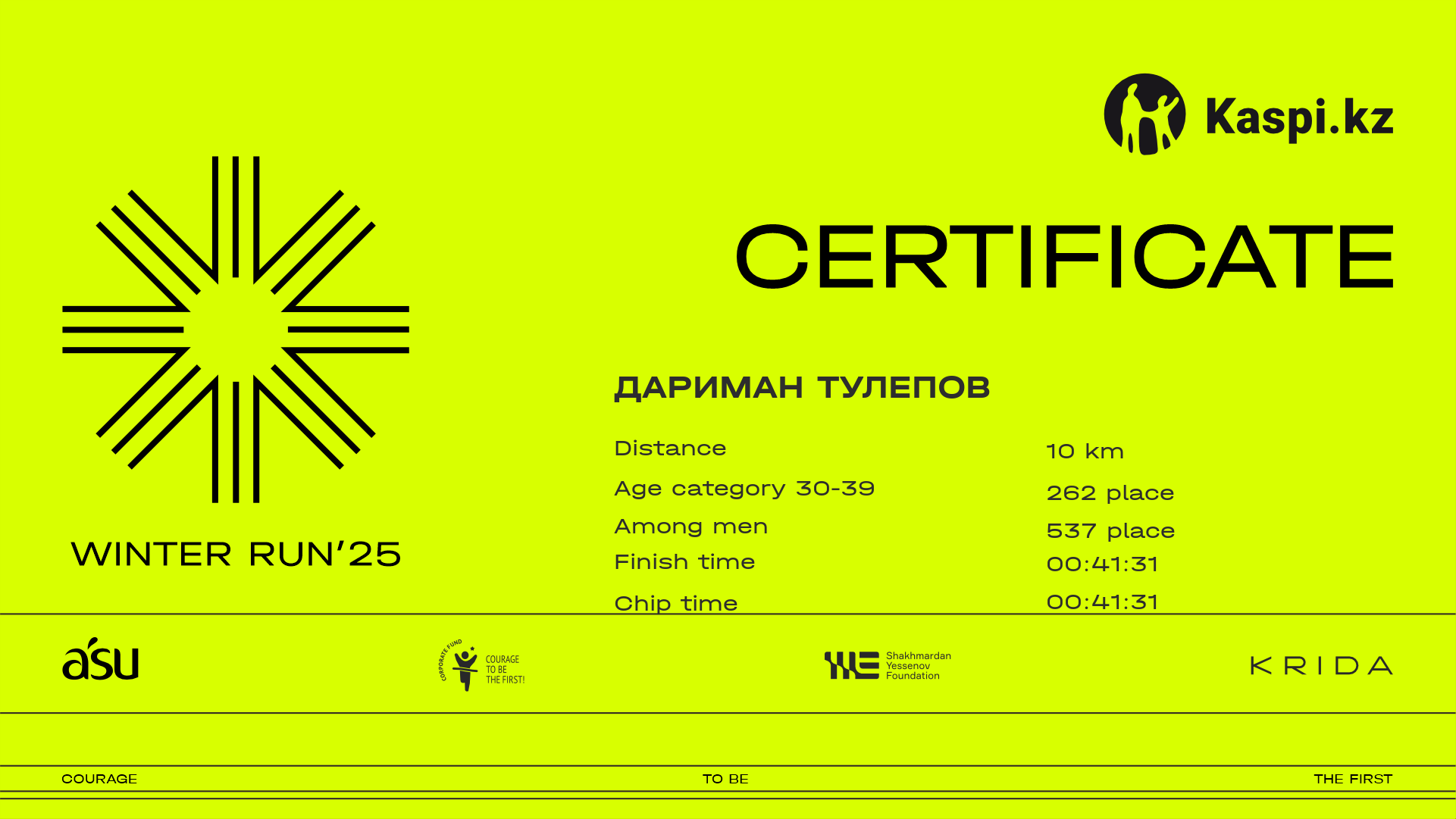 | 1380 | Assiya Zhumatayeva | ![]() | Алматы | 350 | 00:28:42 | 00:53:14 | 01:16:43 | 01:15:34 | Download |