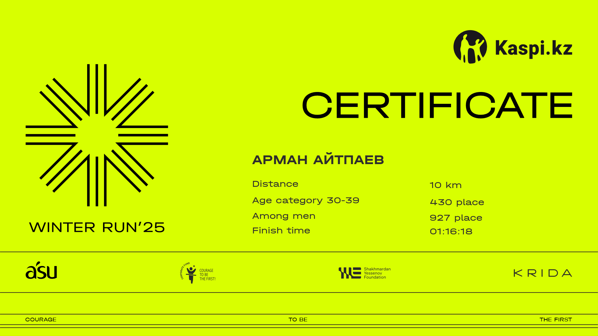 | 1410 | Amirkhan Zhaksylyk | ![]() | Almaty | 425 | 00:28:22 | 00:54:52 | 01:17:31 | 01:16:40 | Download |