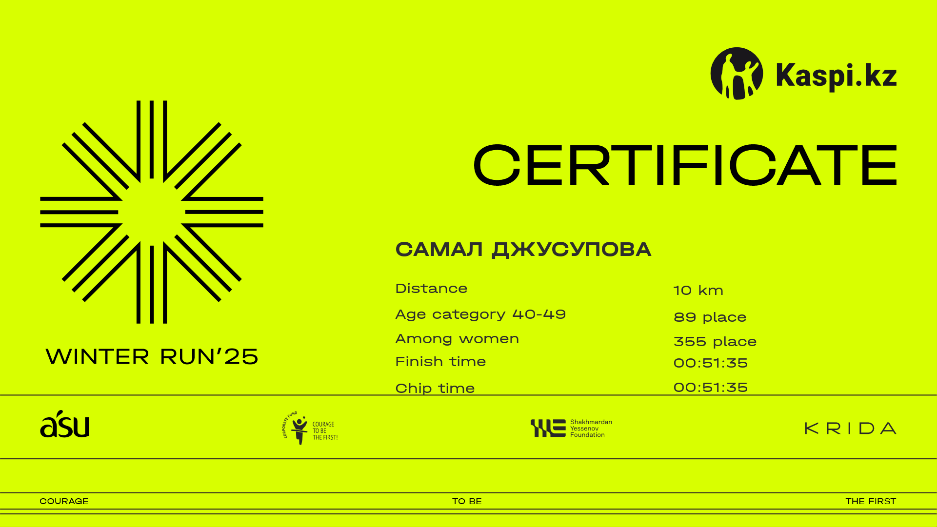 | 1432 | Сагида Абдыгапарова | ![]() | Алматы | 110 | 00:30:08 | 00:55:42 | 01:19:03 | 01:17:49 | Download |
