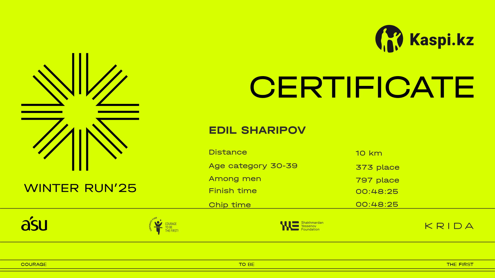 | 481 | Dulat Abdusheitov | ![]() | Алматы | 674 | 00:22:29 | 00:39:28 | 00:54:00 | 00:53:39 | Download |