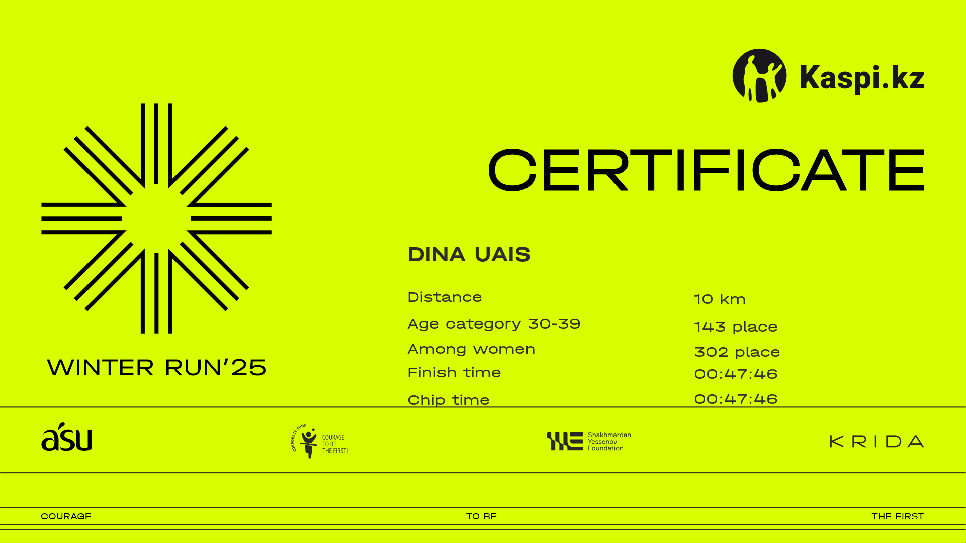 | 1297 | Dinara Zhanassova | ![]() | Алматы | 1661 | 00:30:57 | 00:54:17 | 01:12:50 | 01:12:30 | Download |