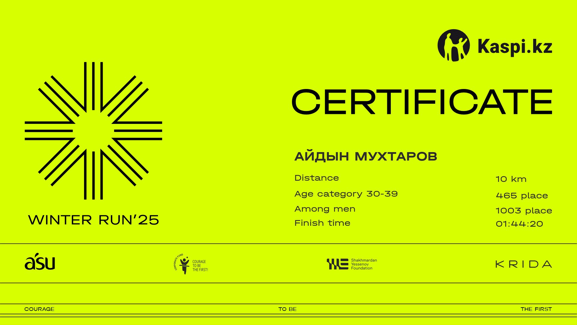 | 1627 | Duman Shakarim | ![]() | Almaty | 1341 | 01:02:35 | 01:31:28 | 01:55:38 | 01:55:38 | Download |