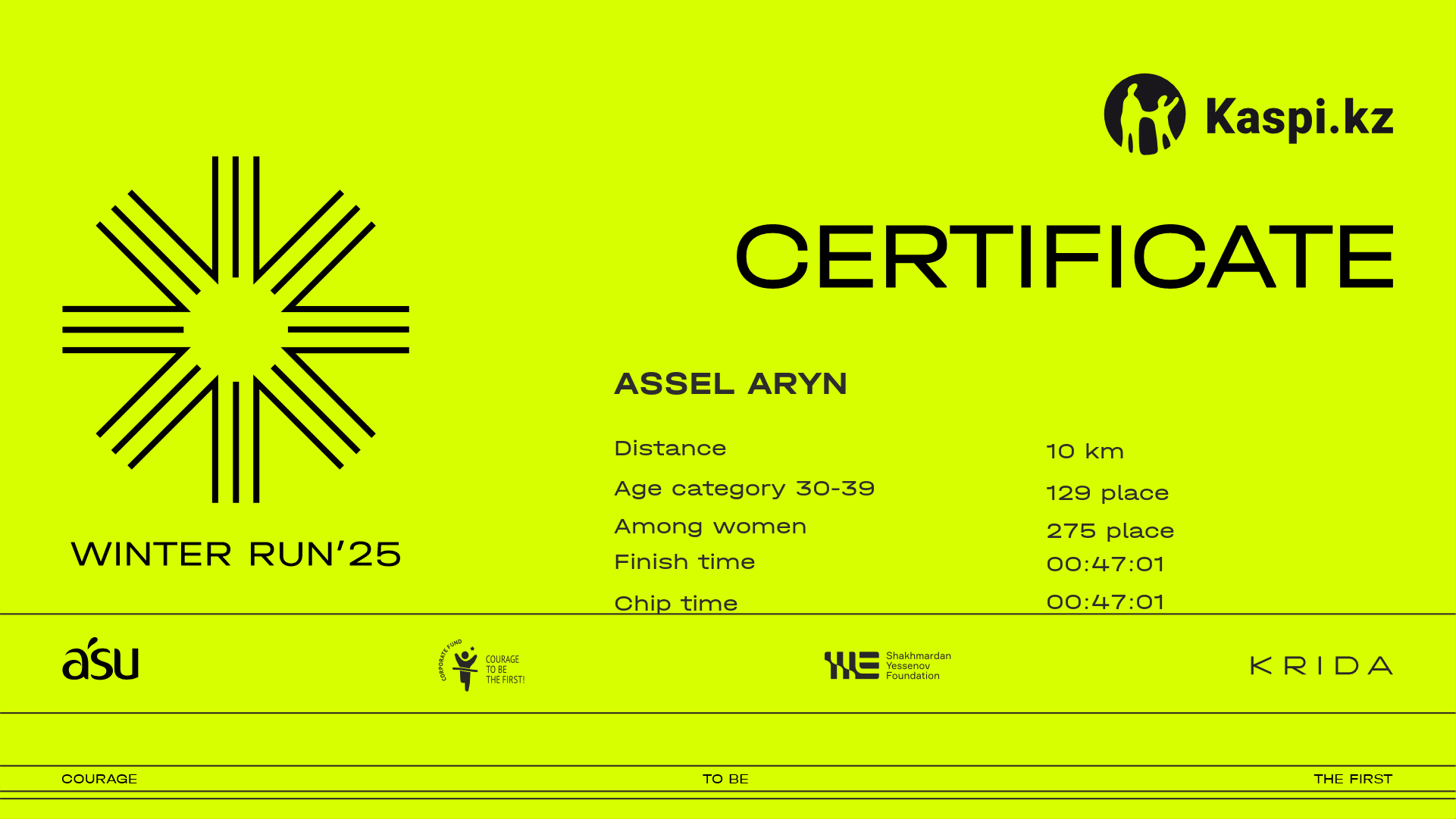 | 1106 | Assel Kulybekova | ![]() | Almaty | 1820 | 00:27:39 | 00:48:55 | 01:08:08 | 01:06:59 | Download |