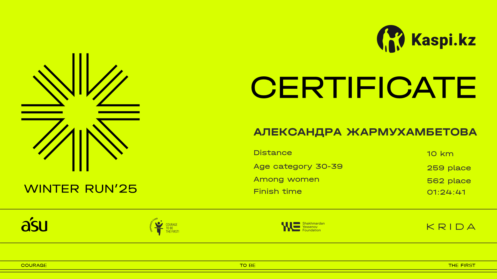 | 1519 | Алина Галижанова | ![]() | Алматы | 32 | 00:32:35 | 00:59:32 | 01:23:54 | 01:22:49 | Download |