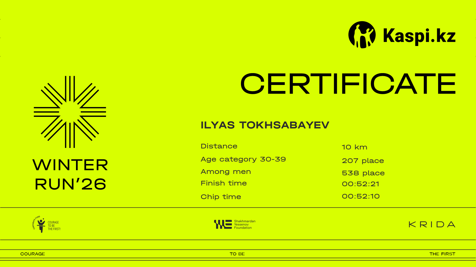 | 620 | Ilyas Tokhsabayev | ![]() | Almaty | 924 | 00:07:18.14 | 00:26:53.87 | 00:44:40.82 | 00:52:21.27 | 00:52:10.38 | Download |