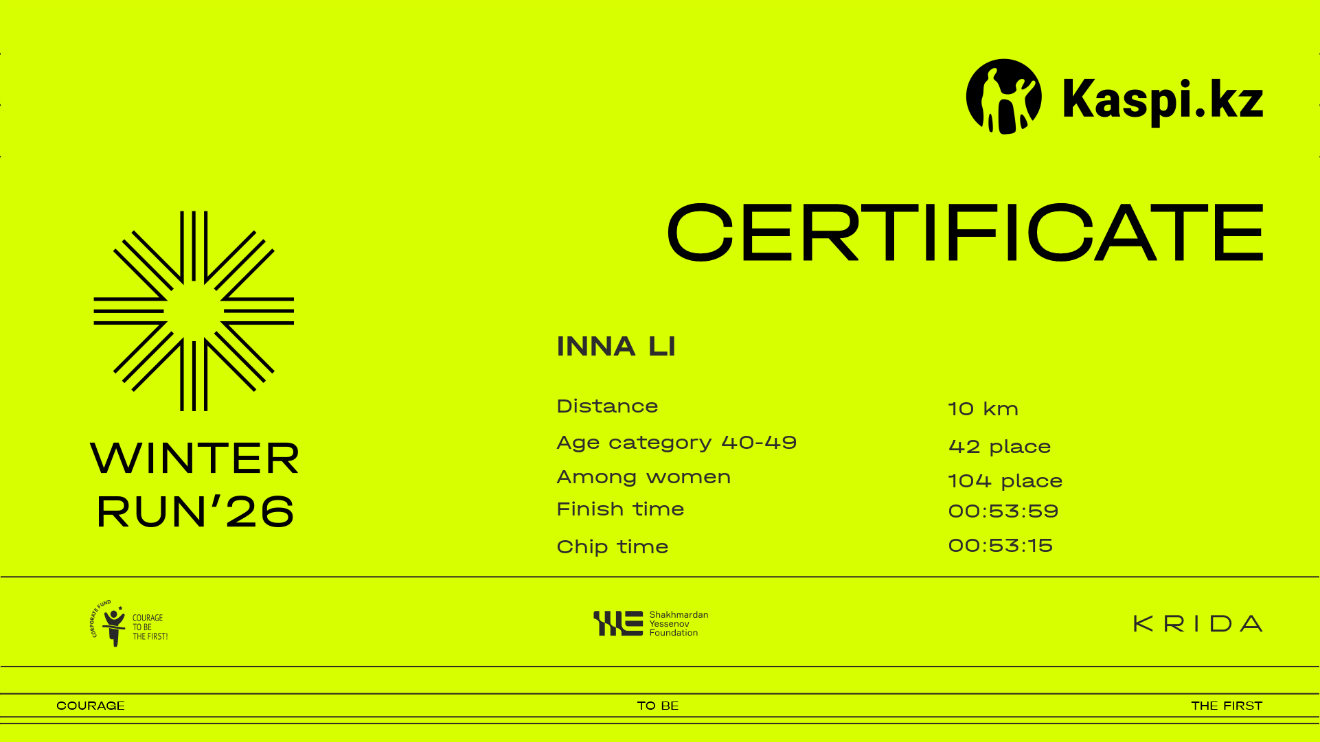 | 713 | Inna Li | ![]() | Алматы | 1200 | 00:08:40.49 | 00:28:44.60 | 00:46:12.32 | 00:53:59.24 | 00:53:15.94 | Download |