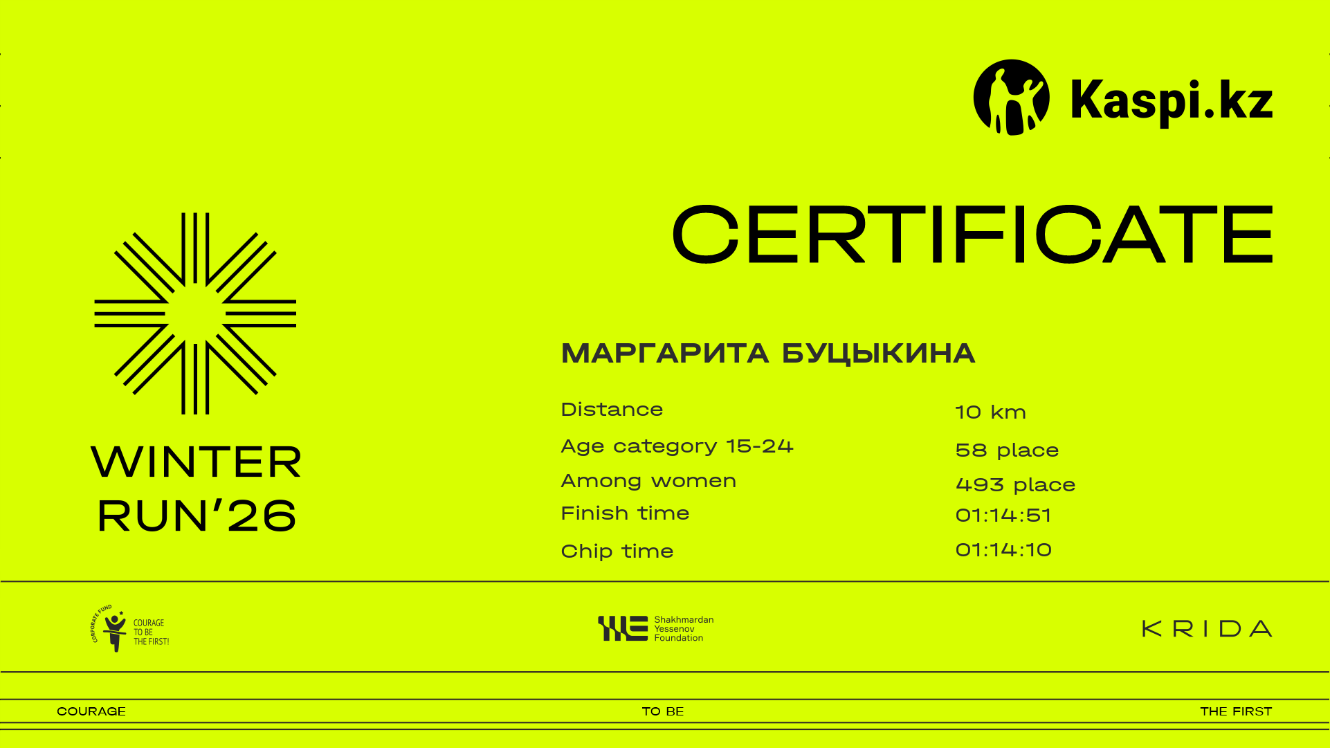 | 1764 | Маргарита Буцыкина | ![]() | Алматы | 1307 | 00:09:01.29 | 00:38:25.75 | 01:03:14.93 | 01:14:51.36 | 01:14:10.91 | Download |