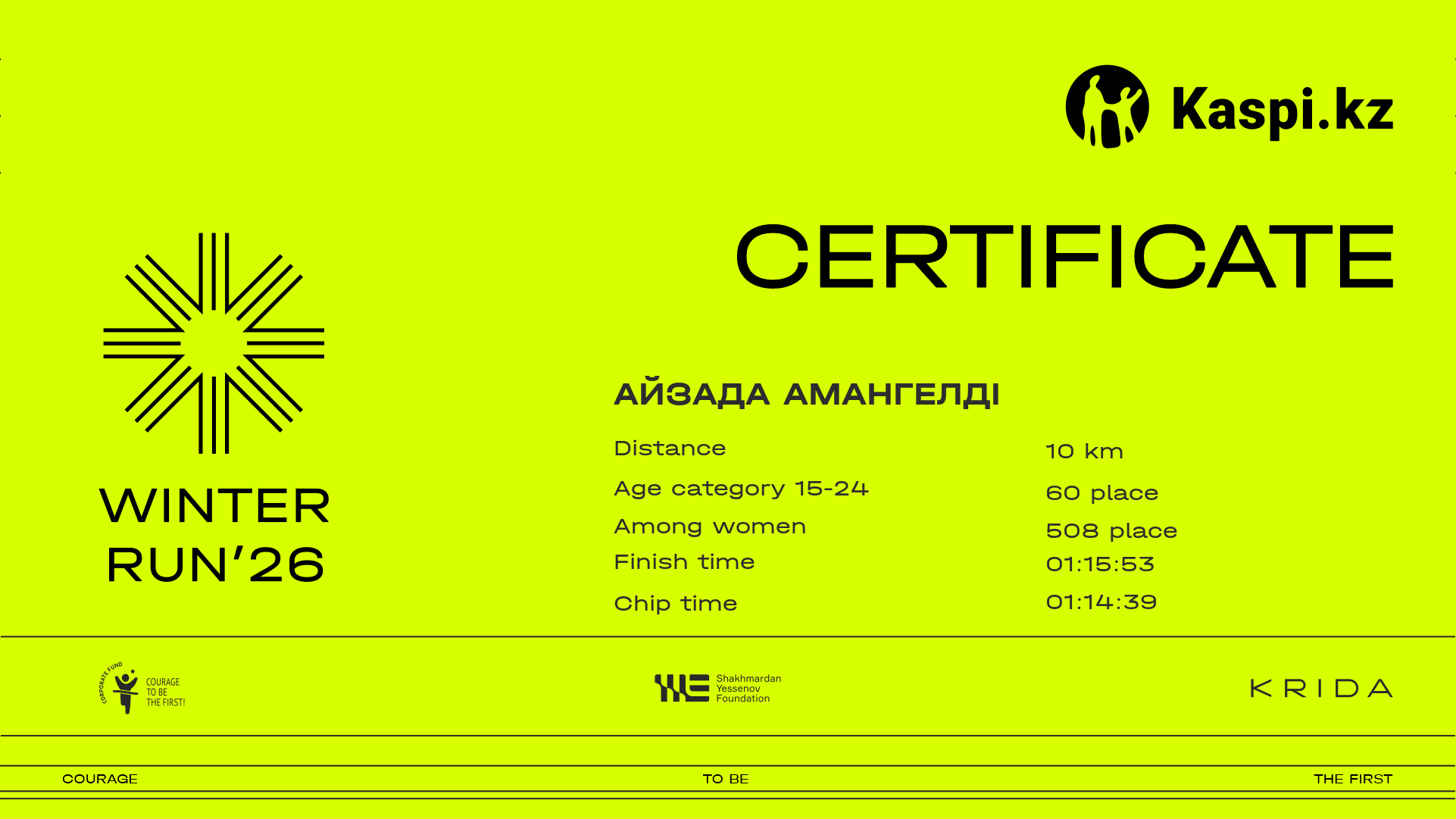 | 1787 | Айзада Амангелді | ![]() | Almaty | 1862 | 00:10:47.45 | 00:38:17.25 | 01:03:53.60 | 01:15:53.18 | 01:14:39.50 | Download |