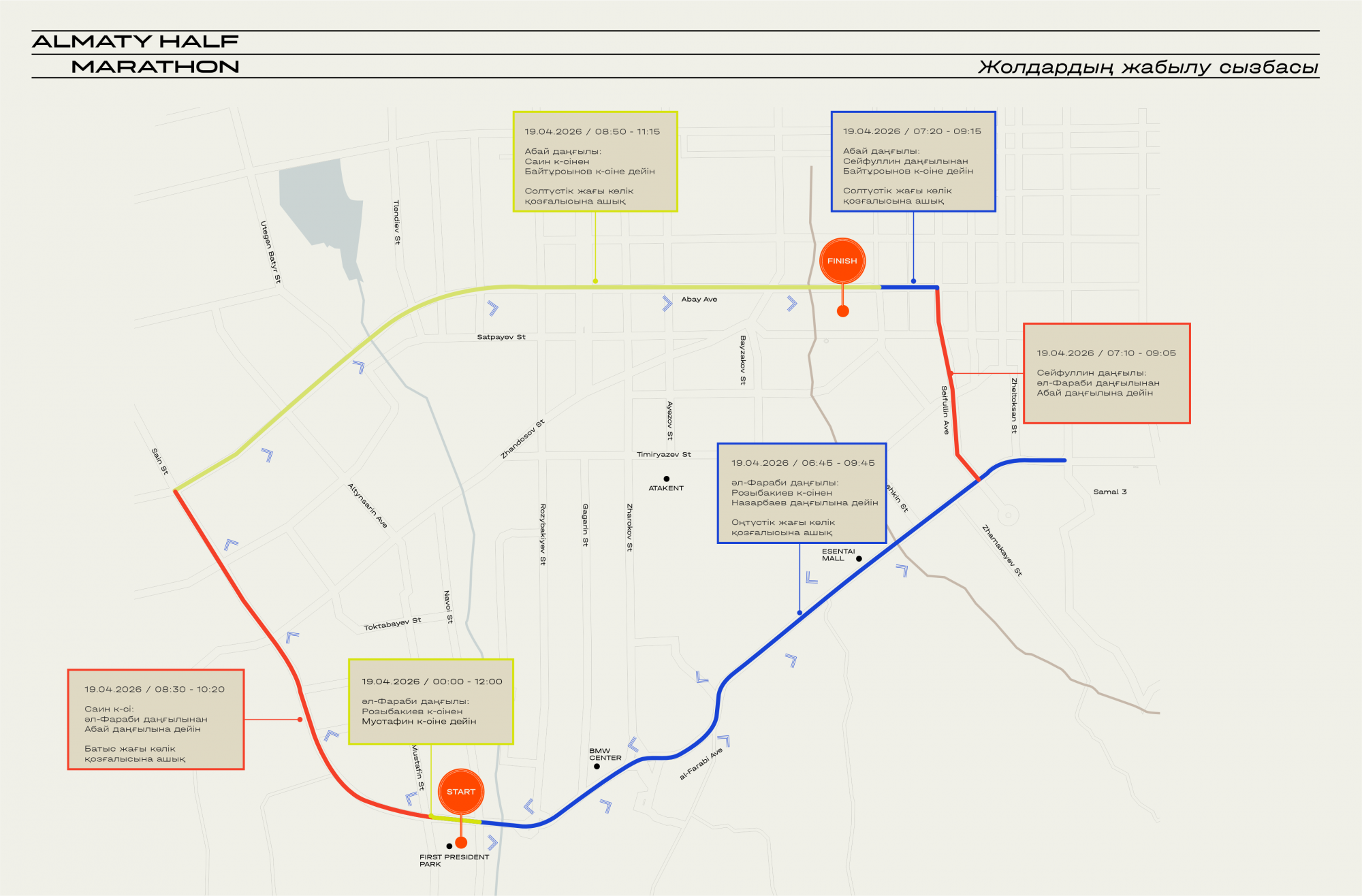 Жарыс таңғы сағат 07:00-де Тұңғыш Президент саябағында басталады. Әл-Фараби даңғылының солтүстік жағымен Розыбакиев көшесінен Мұстафин көшесіне дейінгі жол бөлігі 19 сәуір күні сағат 00:00-ден 12:00-ге дейін жабылады. Оңтүстік жағы ашық болады.