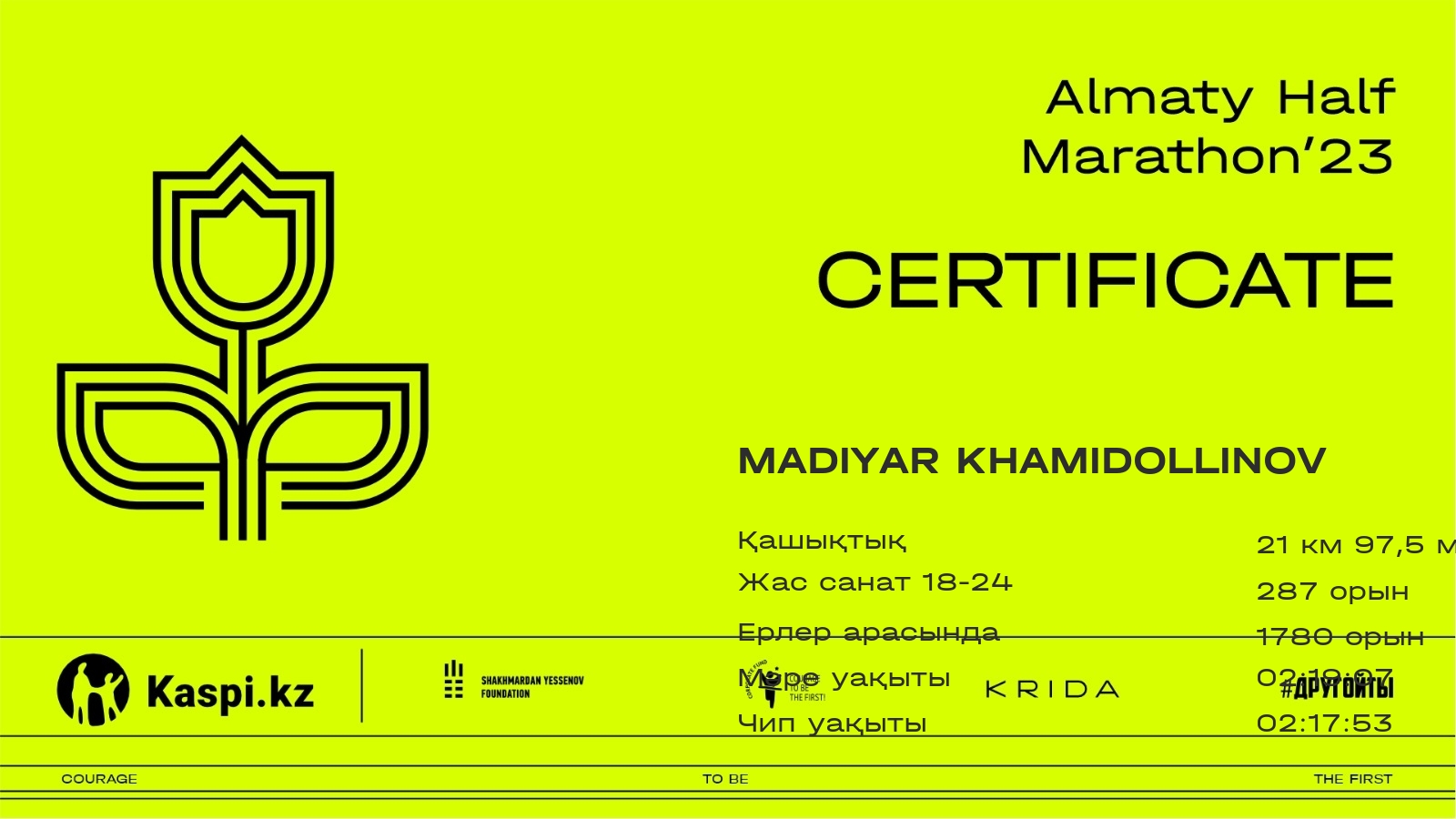 | 2106 | Madiyar Khamidollinov | ![]() | Алматы | 2065 | 01:03:57.15 | 01:35:15.40 | 02:11:52.03 | 02:19:07.29 | 02:17:53.06 | Жүктеп алу | |