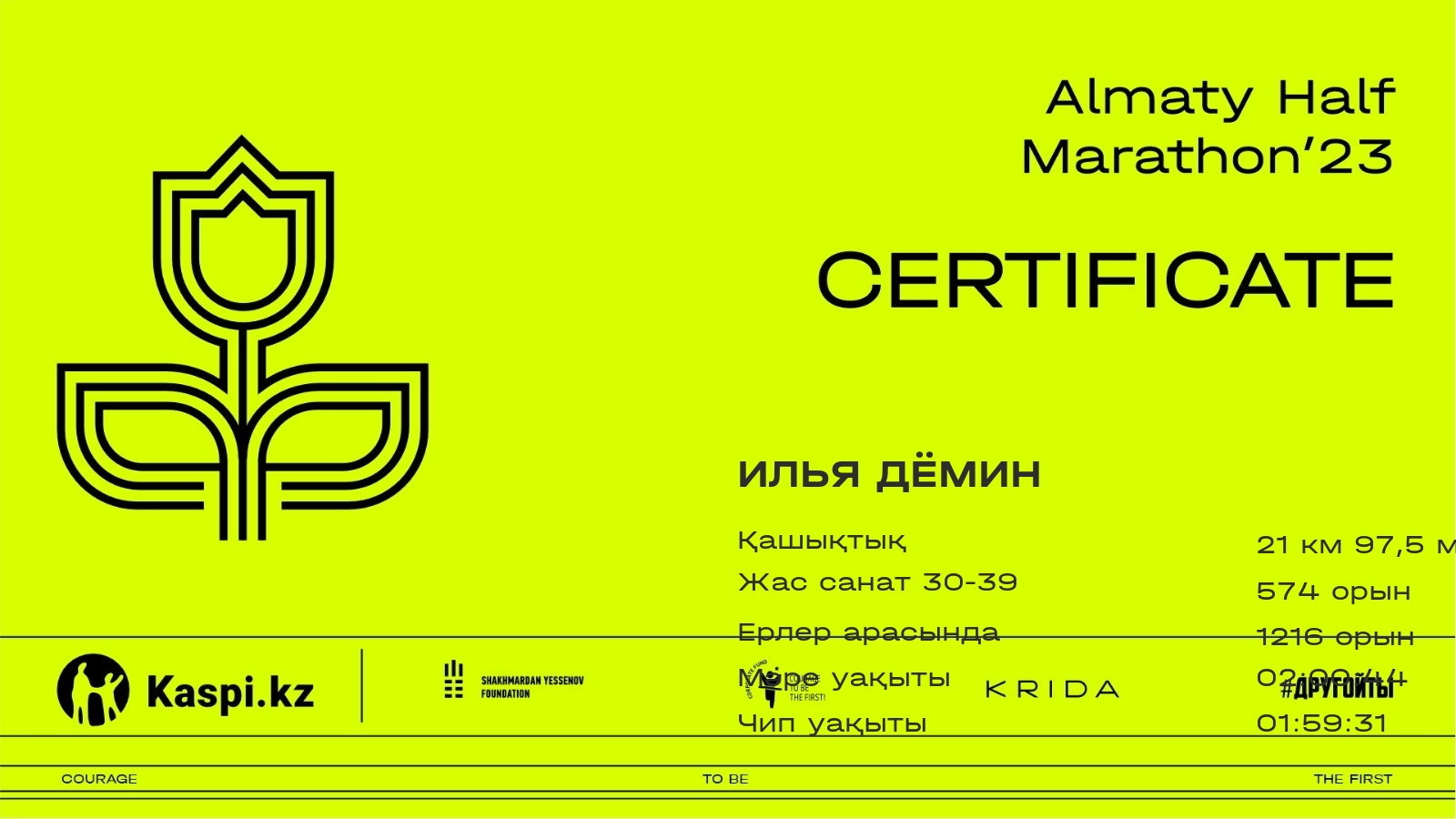 | 863 | Роман Бугаенко | ![]() | Алматы | 562 | 00:27:10.91 | 00:55:14.17 | 01:19:24.48 | 01:44:38.77 | 01:50:22.50 | 01:50:01.23 | Жүктеп алу |