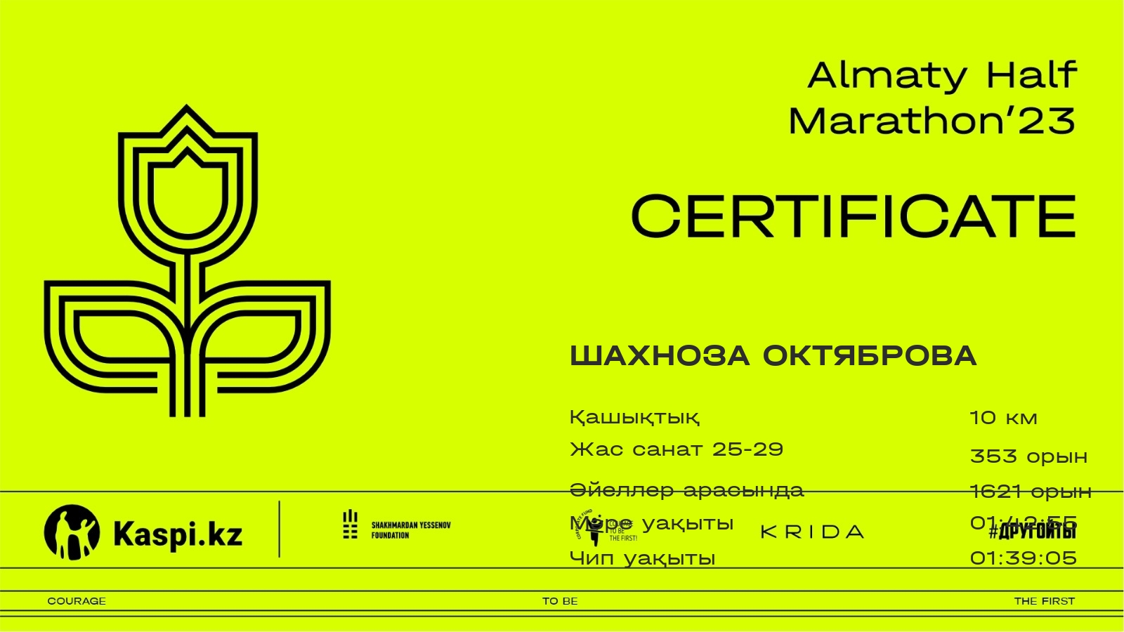 | 3474 | Айнура Айдингалиева | ![]() | Алматы | 6980 | 01:42:54.91 | 01:40:45.14 | Жүктеп алу | |