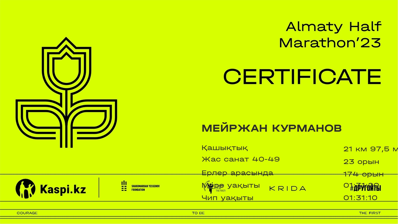 | 190 | Данияр Отеп | ![]() | Алматы | 1809 | 00:20:59.74 | 00:44:13.47 | 01:31:46.41 | 01:31:23.69 | Жүктеп алу | ||