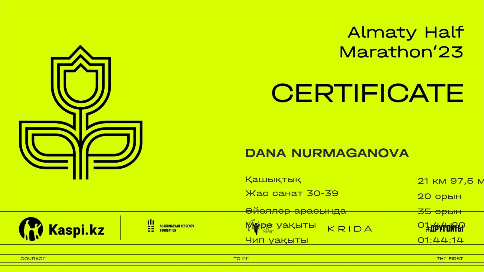 | 2343 | Арулан Жақабай | ![]() | Алматы | 274 | 00:36:03.65 | 01:13:26.32 | 01:45:55.88 | 02:19:14.26 | 02:27:03.36 | 02:25:07.26 | Жүктеп алу |