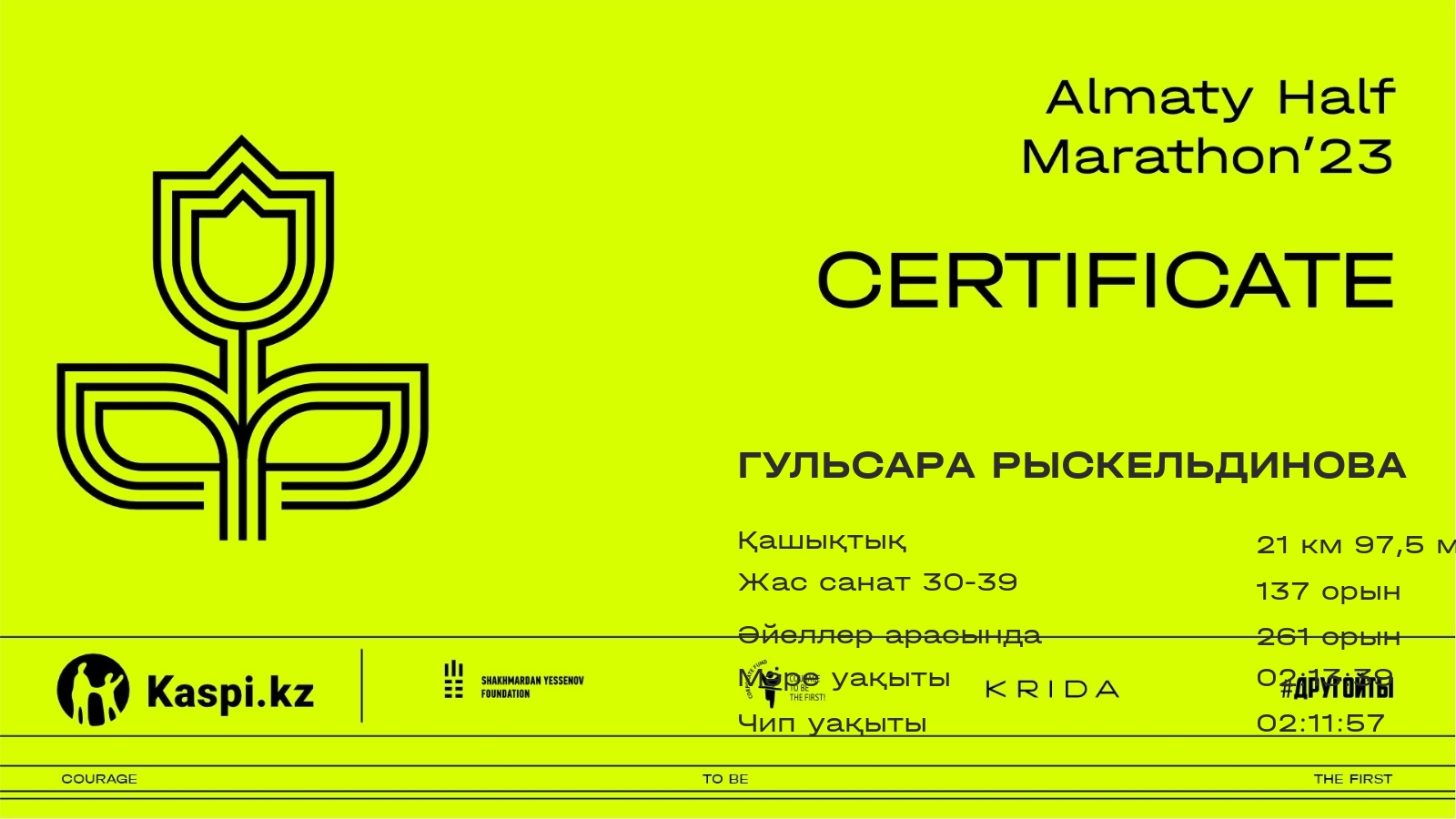 | 2300 | Дильдара Нурмахаметова | ![]() | Алматы | 2193 | 00:33:57.54 | 01:11:26.78 | 01:44:42.12 | 02:18:21.03 | 02:25:26.52 | 02:24:00.68 | Жүктеп алу |