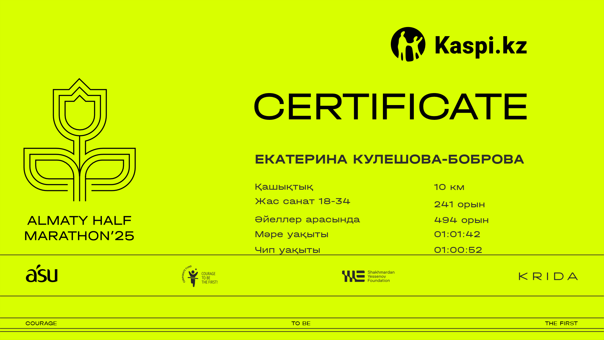 | 1664 | Dana Turgali | ![]() | Алматы | 8401 | 00:41:31 | 01:01:34 | 00:58:28 | Жүктеп алу |