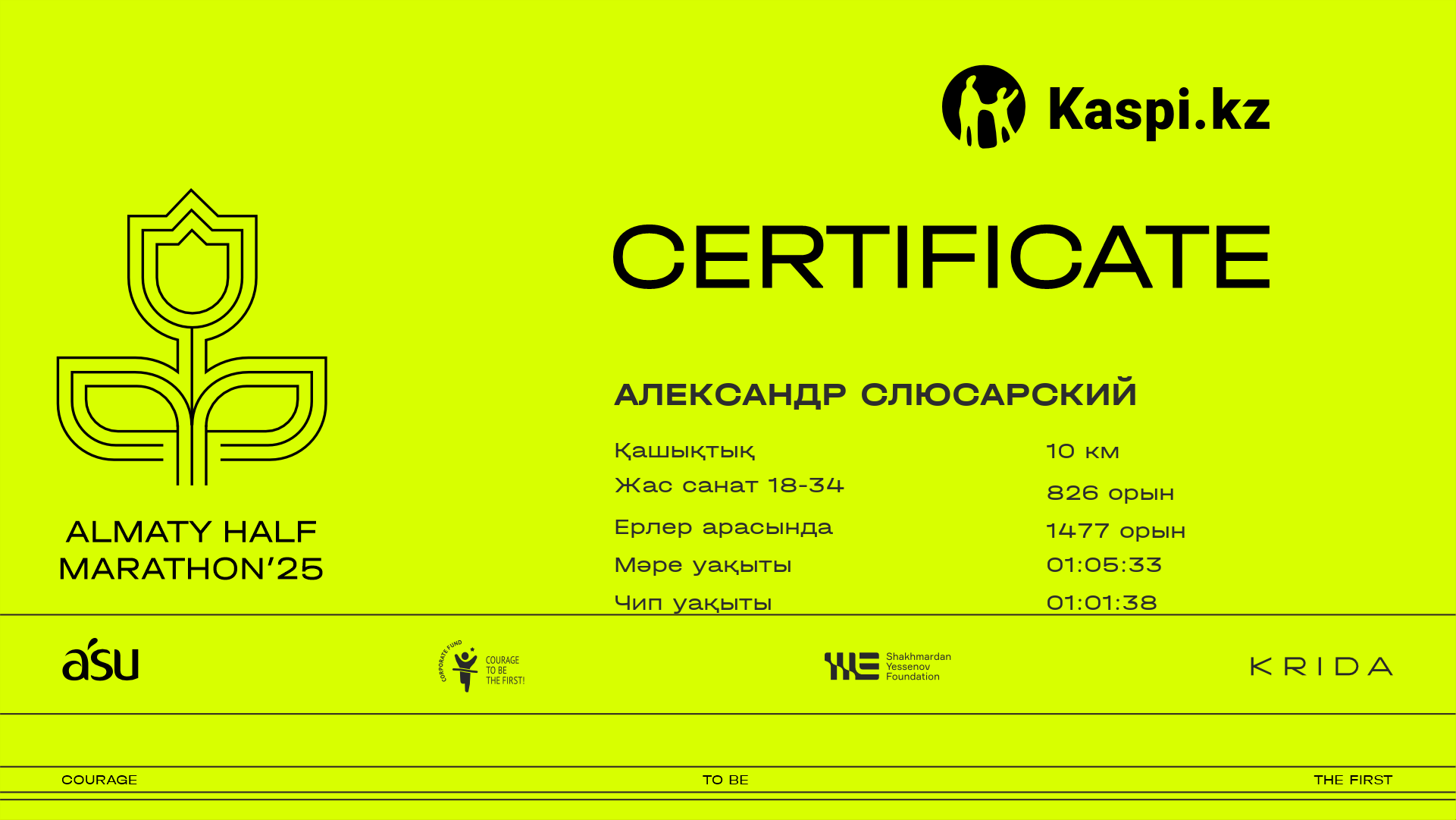 | 2167 | Александр Слюсарский | ![]() | Алматы | 9077 | 00:44:48 | 01:05:33 | 01:01:38 | Жүктеп алу |