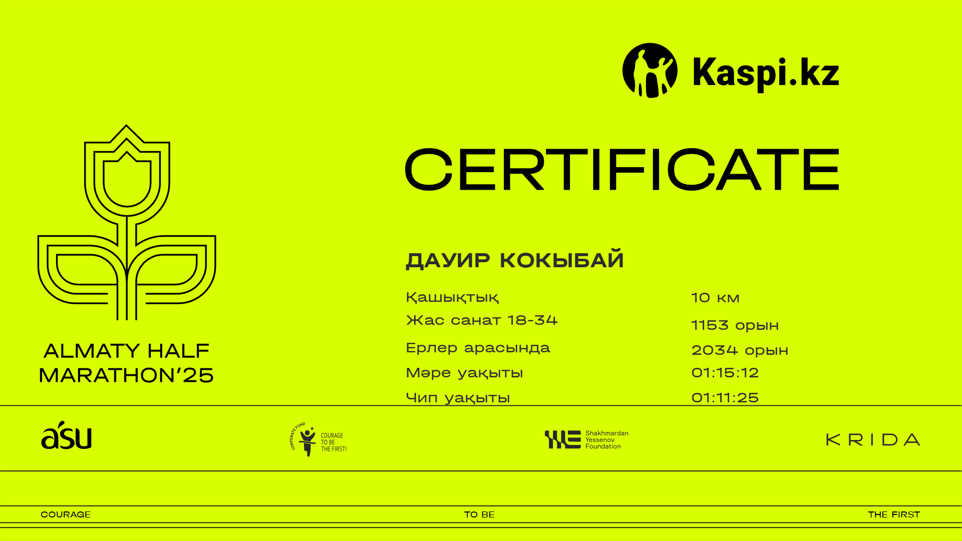 | 4431 | Шолпан Жолдыбалина | ![]() | Алматы | 9071 | 01:00:20 | 01:28:17 | 01:24:22 | Жүктеп алу |