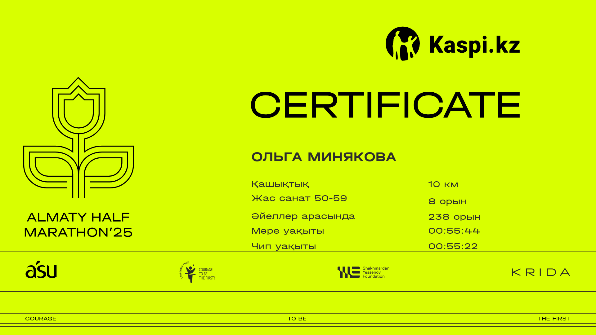 | 2219 | Асем Жунусова | ![]() | Алматы | 4531 | 00:43:28 | 01:06:01 | 01:05:19 | Жүктеп алу |