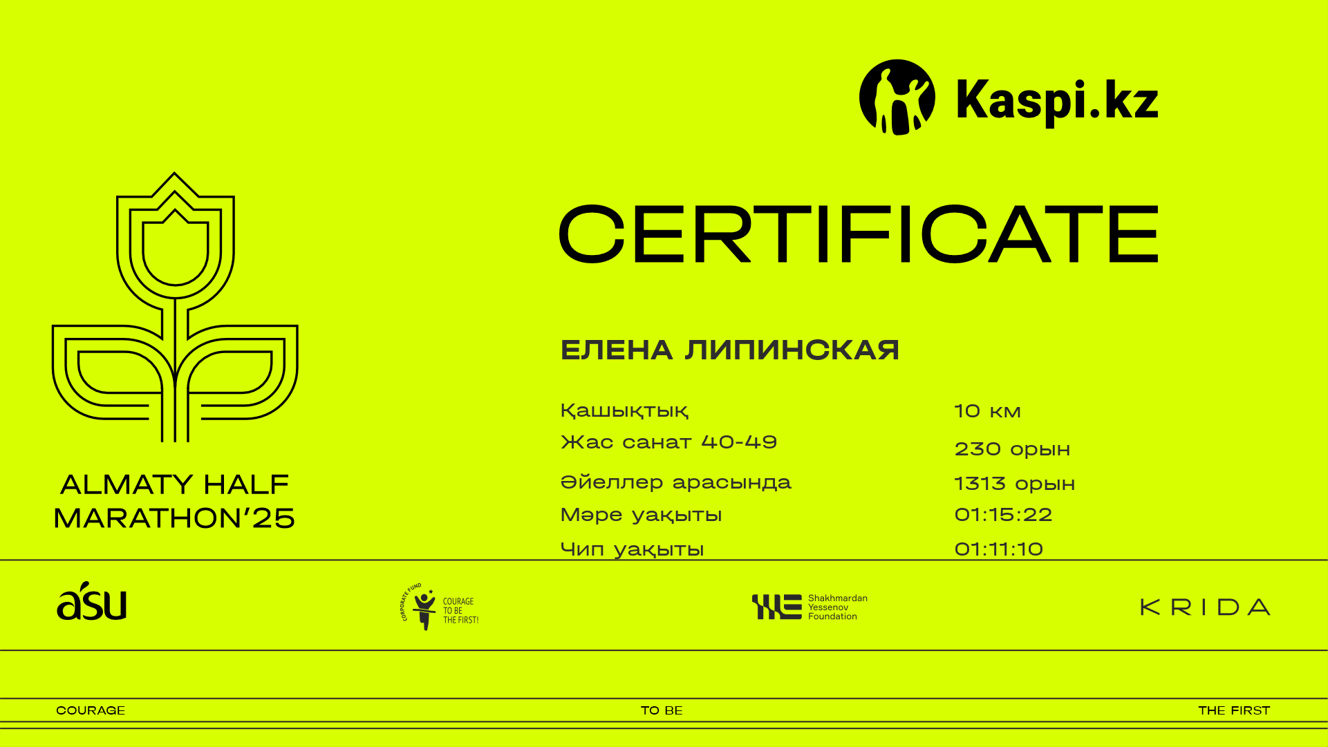 | 2928 | Куралай Сулейменова | ![]() | Алматы | 4710 | 00:46:02 | 01:11:35 | 01:10:50 | Жүктеп алу |