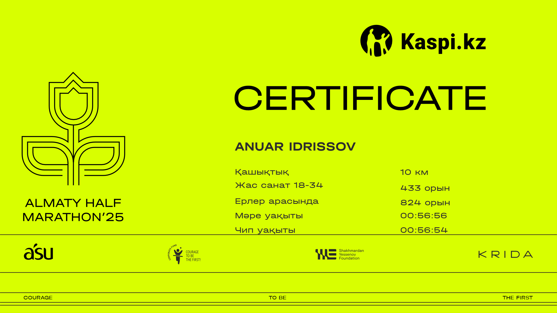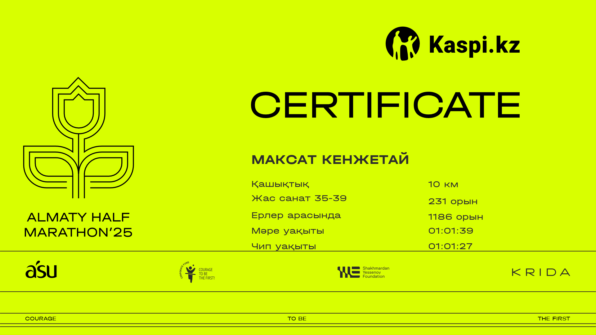 | 5052 | Arina Zhandossova | ![]() | Алматы | 4086 | 01:09:53 | 01:49:49 | 01:48:31 | Жүктеп алу |