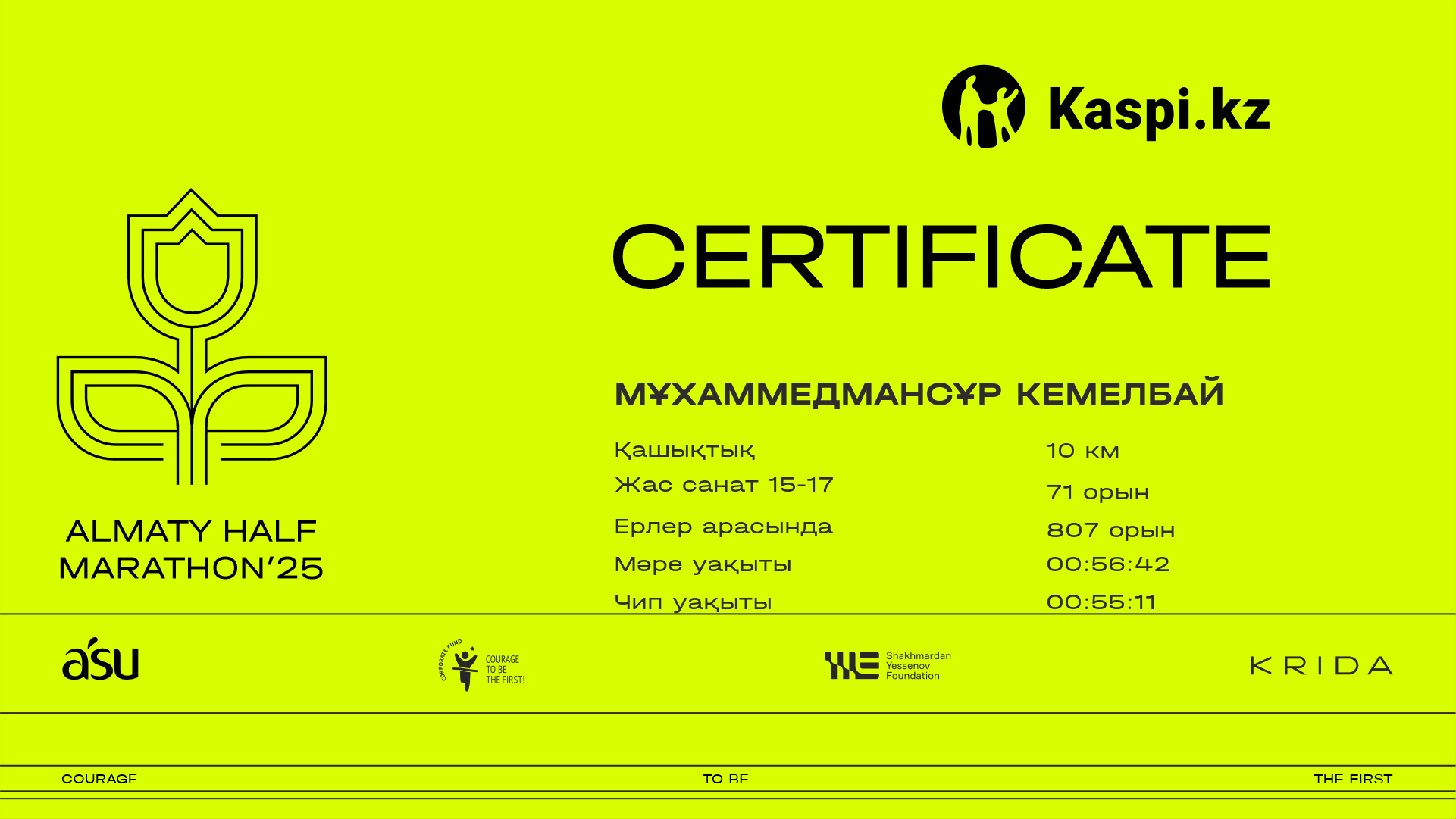 | 1078 | Бауржан Жусиев | ![]() | Алматы | 6942 | 00:37:09 | 00:56:52 | 00:55:30 | Жүктеп алу |
