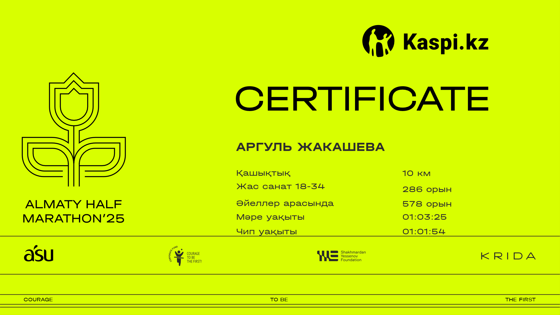 | 1079 | Assel Sembina | ![]() | Астана | 7106 | 00:37:20 | 00:56:52 | 00:56:26 | Жүктеп алу |