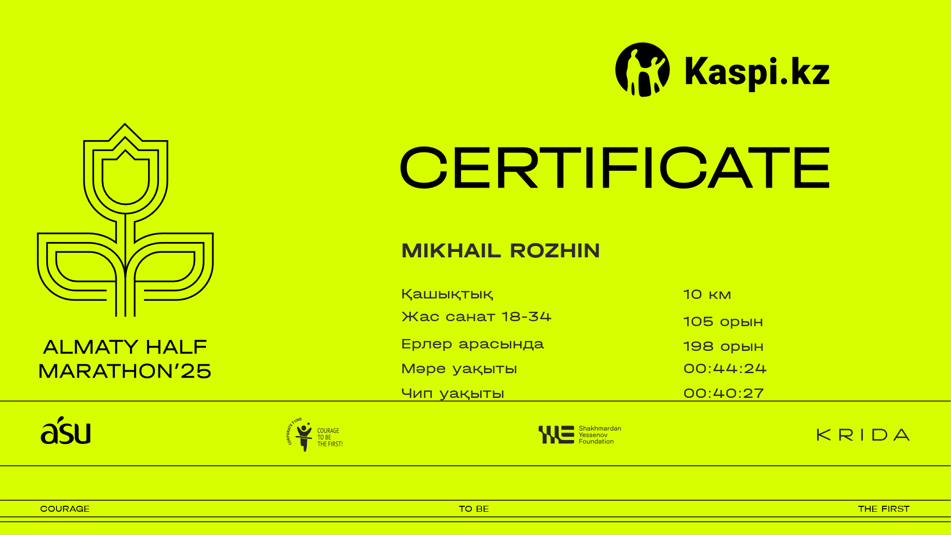 | 231 | Mikhail Rozhin | ![]() | Алматы | 8946 | 00:30:04 | 00:44:24 | 00:40:27 | Жүктеп алу |