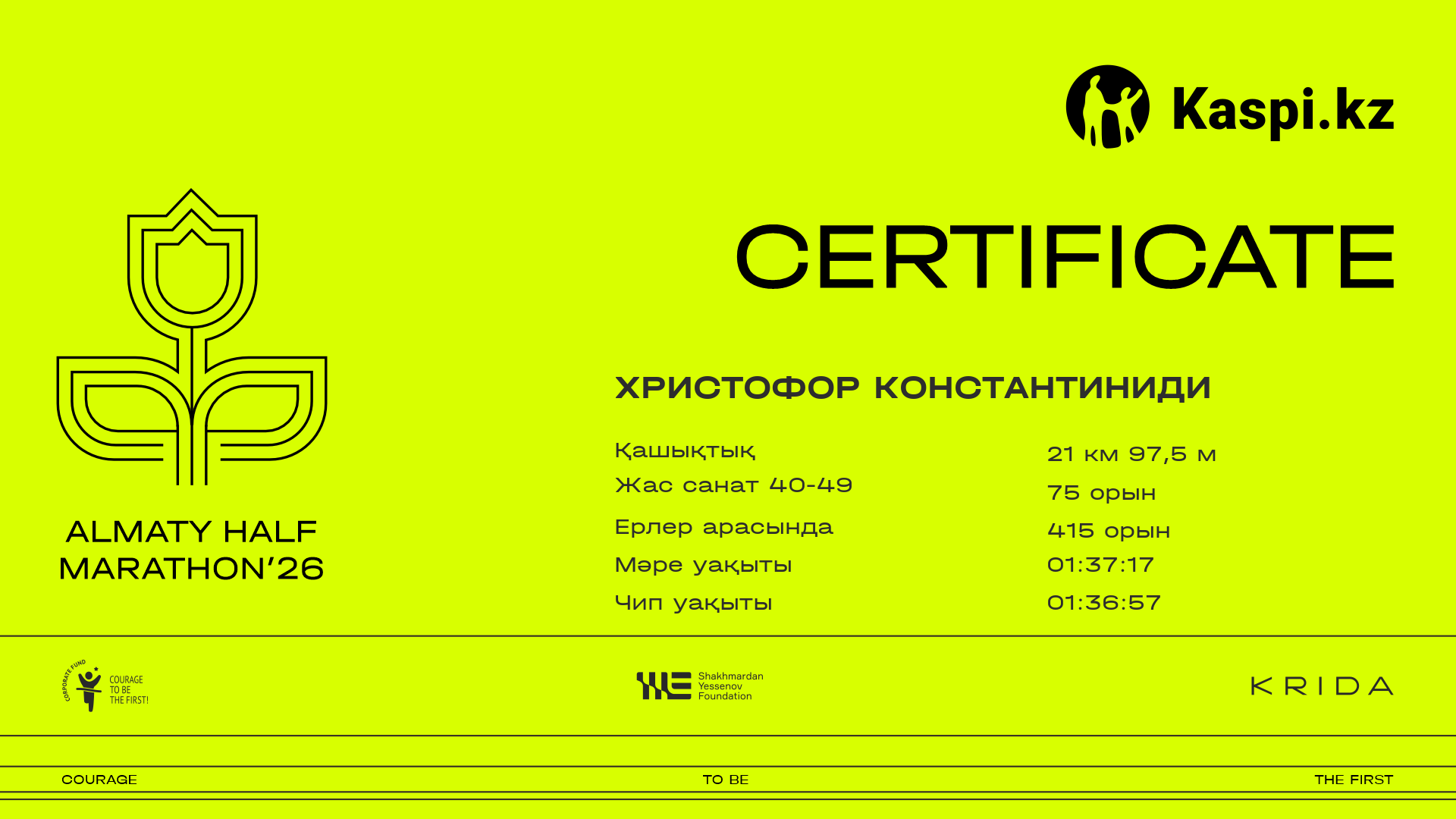 | 415 | Христофор Константиниди | ![]() | Алматы | 569 | 00:21:24 | 00:46:38 | 01:08:33 | 01:32:32 | 01:37:17 | 01:36:57 | Жүктеп алу |
