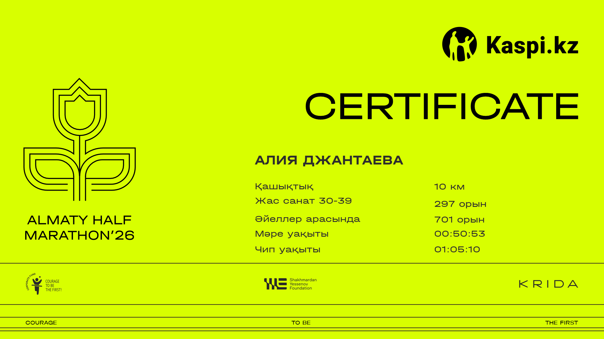 | 701 | Алия Джантаева | ![]() | Алматы | 9035 | 00:32:45 | 00:44:00 | 00:50:53 | 01:05:10 | Жүктеп алу |