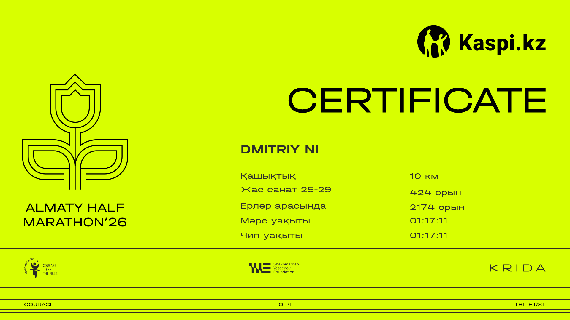 | 4299 | Darkhan Kurmanbayev | ![]() | Алматы | 9842 | 00:44:30 | 00:58:22 | 01:30:27 | 01:28:41 | Жүктеп алу |